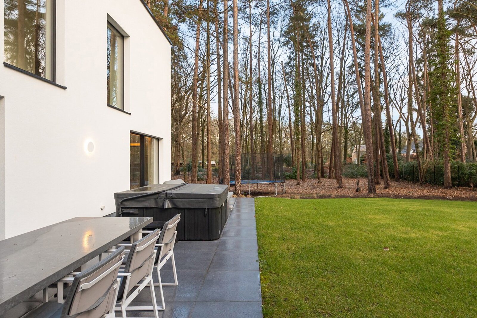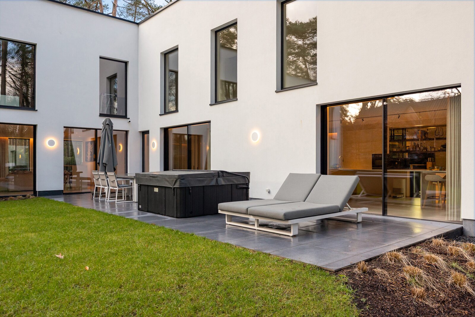 Het terras van 40 m² sluit naadloos aan op de leefruimtes en biedt prachtig uitzicht op de fraai aangelegde tuin met automatische toegangspoort.