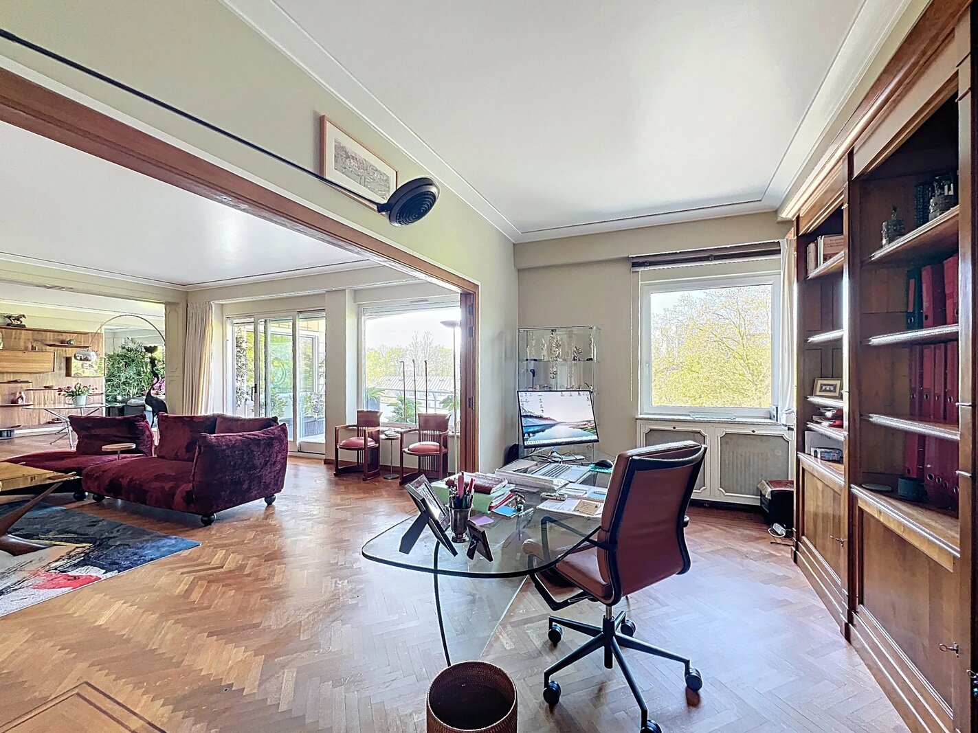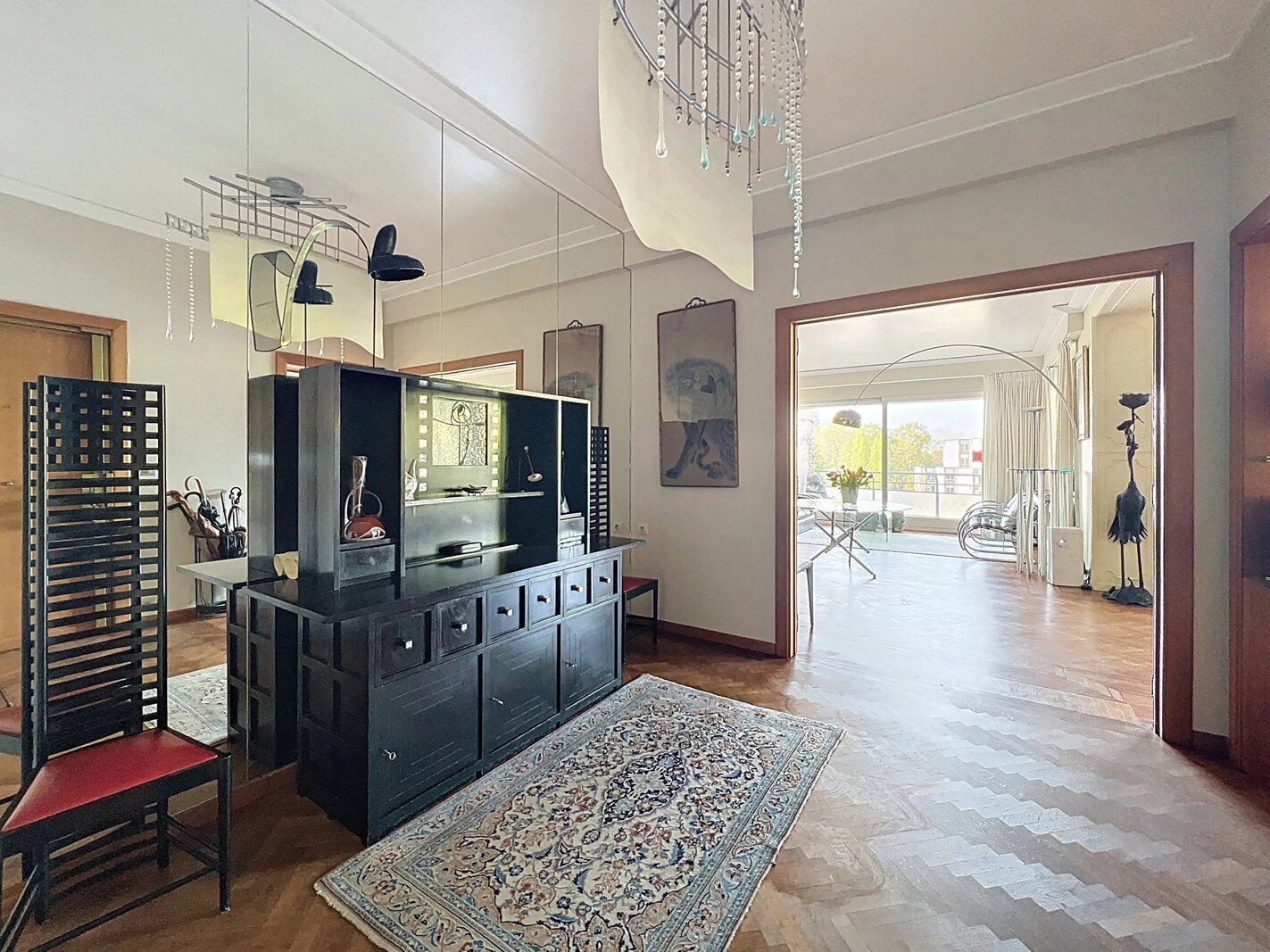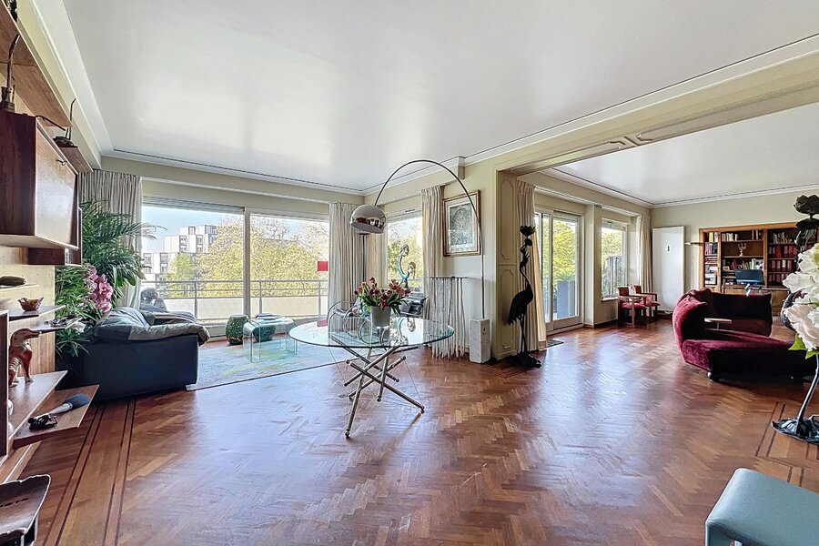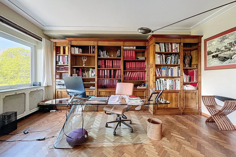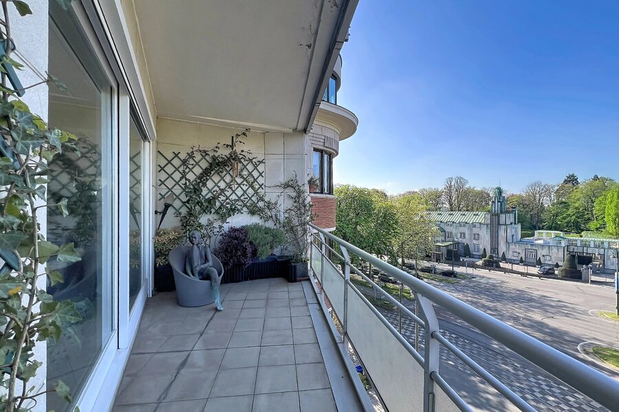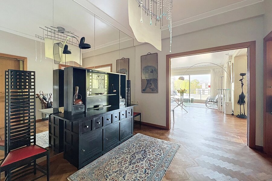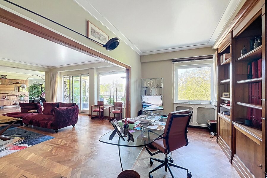 Located on the 4th floor, it is composed as follows: a large entrance hall with wardrobe and guest toilet, beautiful and spacious bright receptions with a double terrace and its sublime view of the Stoclet Palace, a large office, a kitchen with a utility room, a balcony, and a dining area (originally a bedroom), a large bedroom (merger of two bedrooms), a shower room, the master bedroom with its en-suite bathroom, a dressing room.