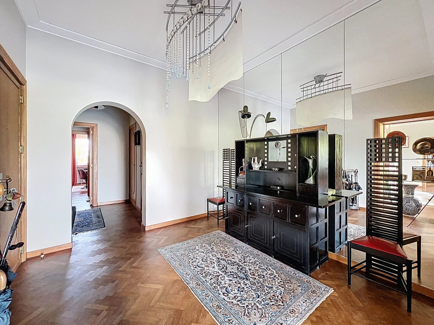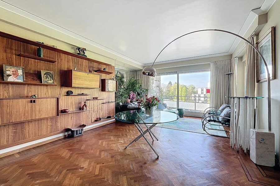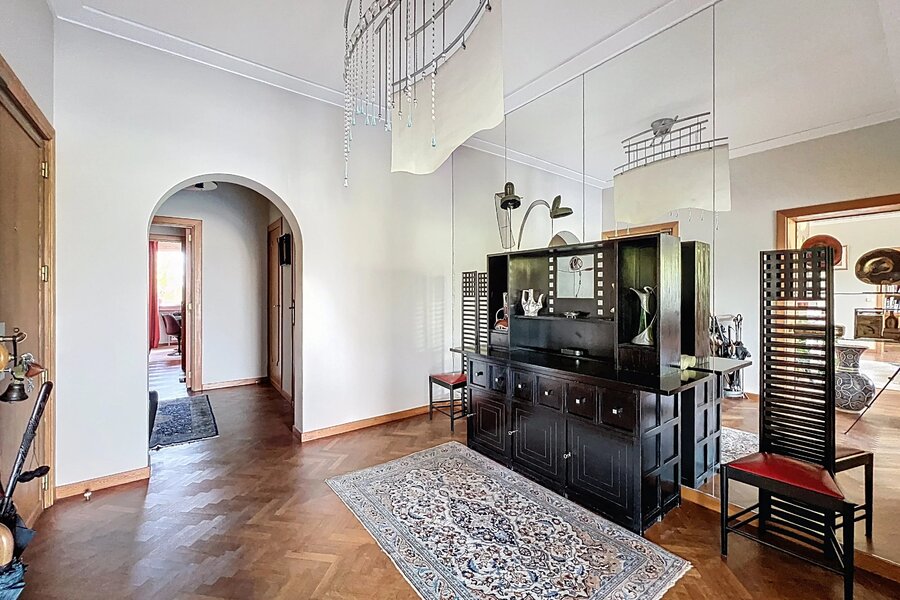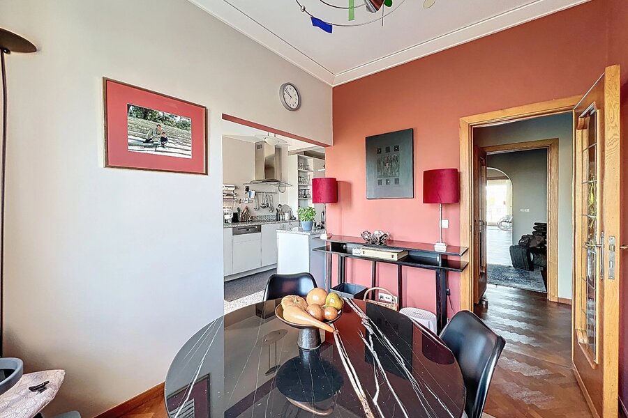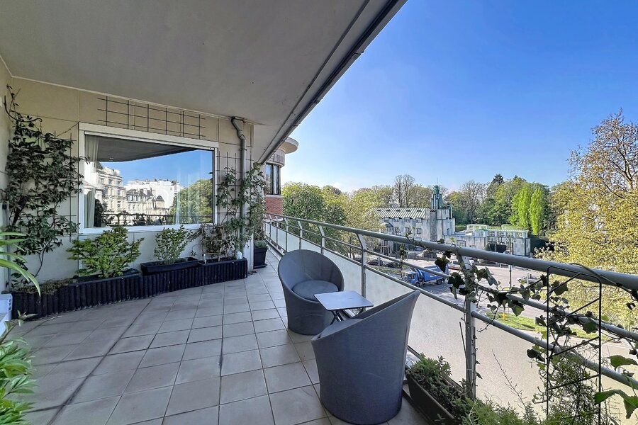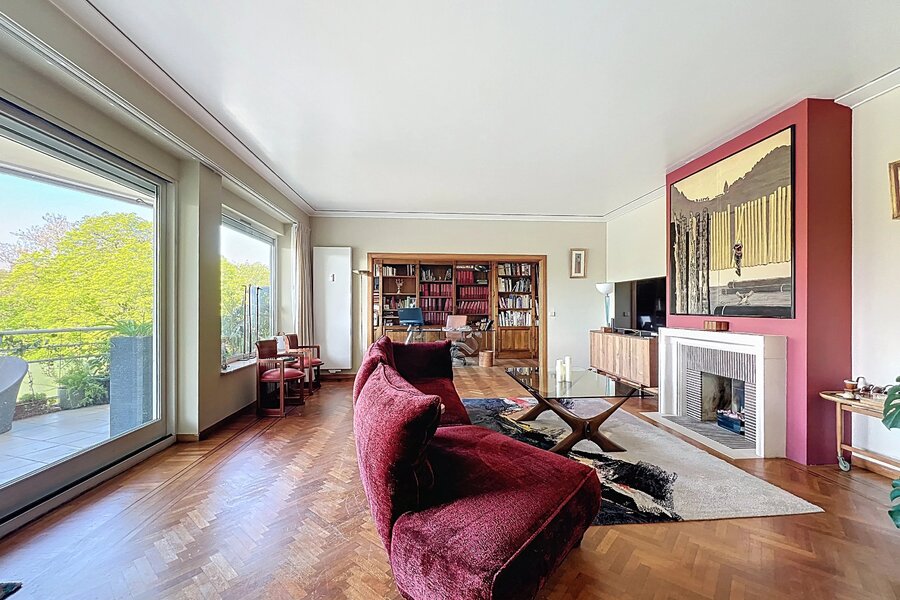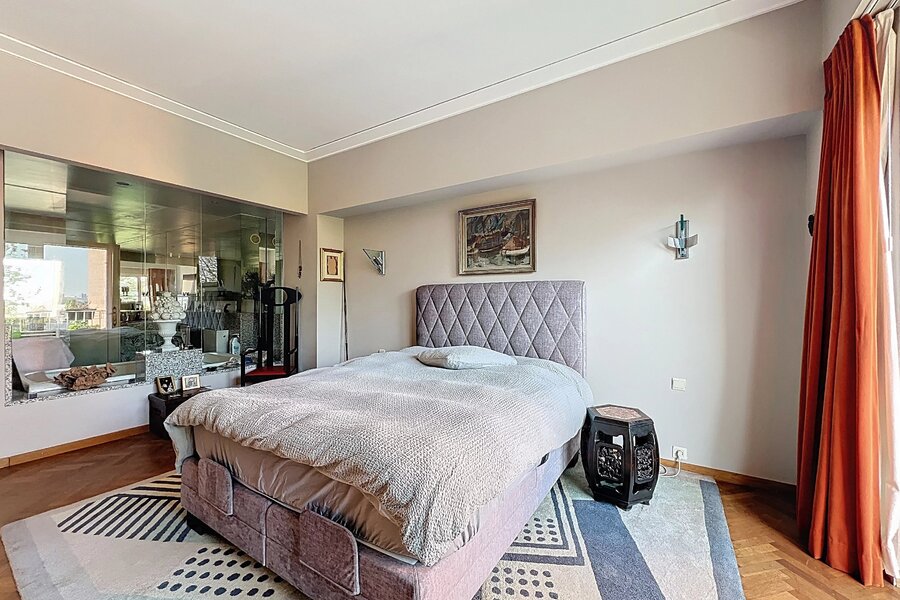 Located on the 4th floor, it is composed as follows: a large entrance hall with wardrobe and guest toilet, beautiful and spacious bright receptions with a double terrace and its sublime view of the Stoclet Palace, a large office, a kitchen with a utility room, a balcony, and a dining area (originally a bedroom), a large bedroom (merger of two bedrooms), a shower room, the master bedroom with its en-suite bathroom, a dressing room.