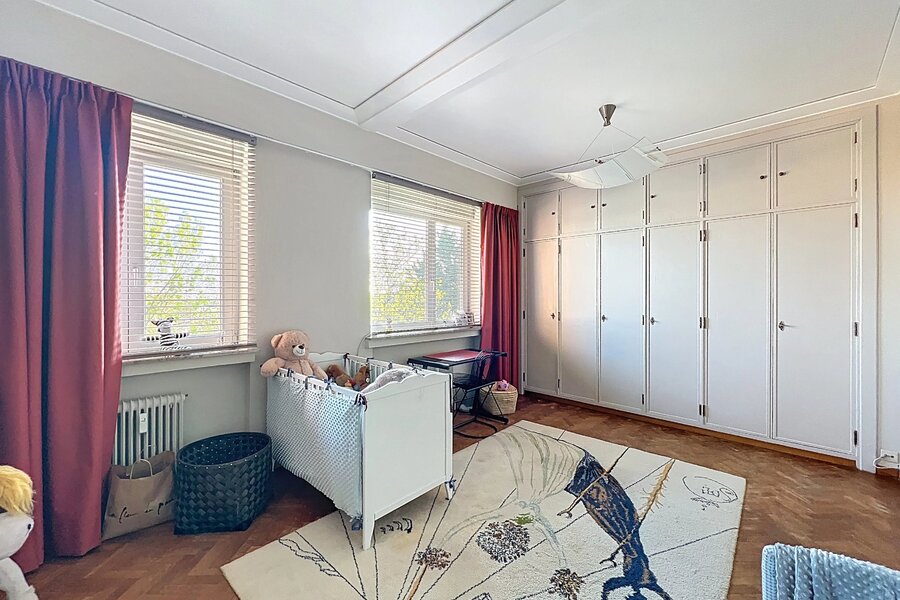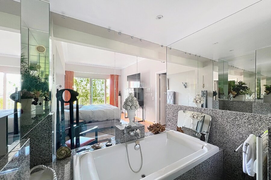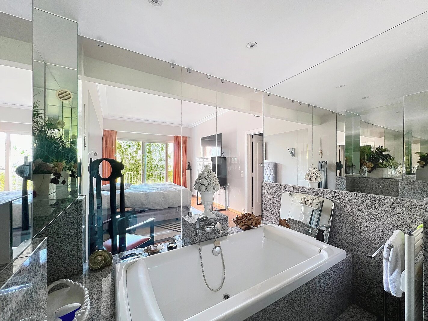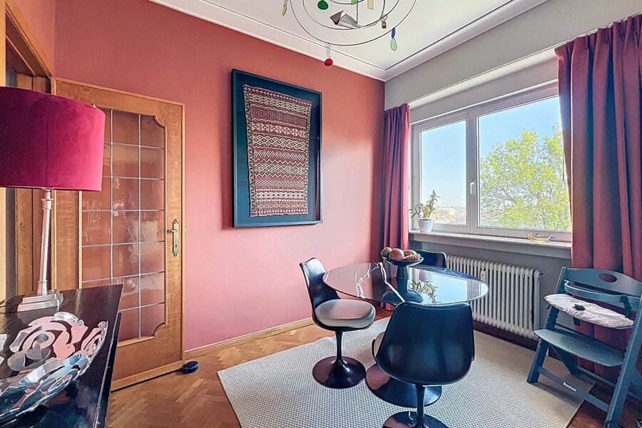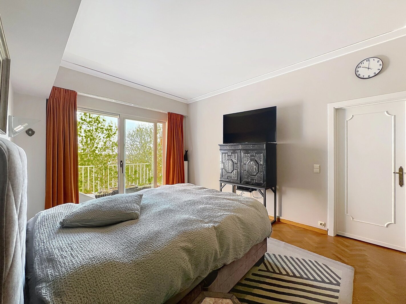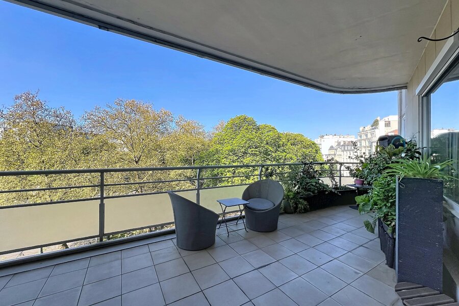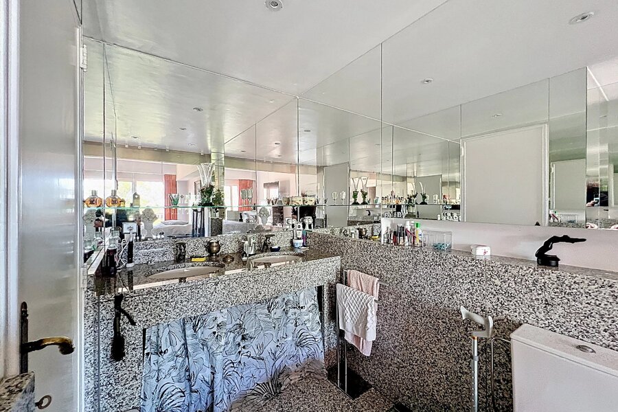 Located on the 4th floor, it is composed as follows: a large entrance hall with wardrobe and guest toilet, beautiful and spacious bright receptions with a double terrace and its sublime view of the Stoclet Palace, a large office, a kitchen with a utility room, a balcony, and a dining area (originally a bedroom), a large bedroom (merger of two bedrooms), a shower room, the master bedroom with its en-suite bathroom, a dressing room.