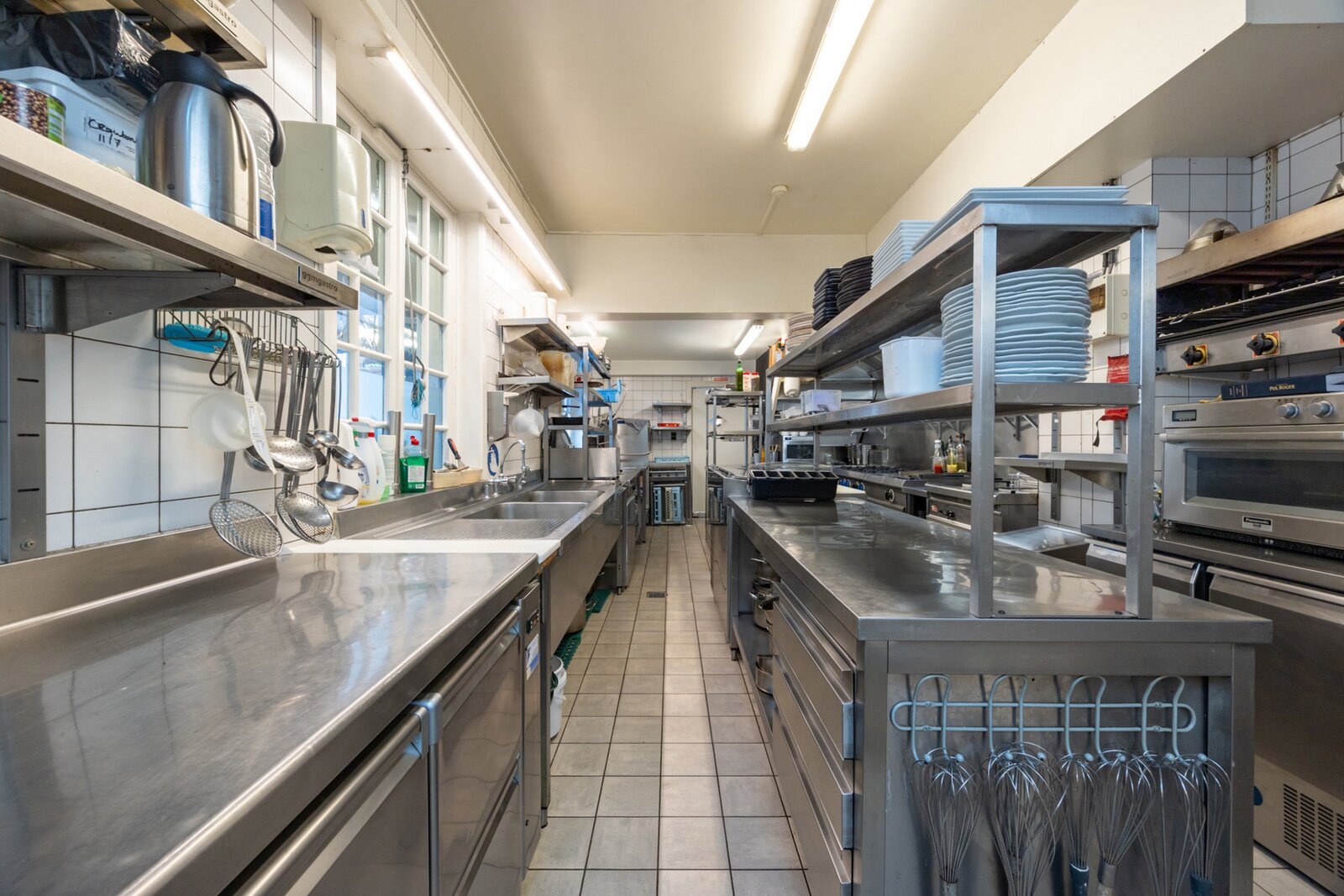 Achterliggend bevinden zich een bijkeuken van 20m² en een keuken van 30m² die volledig is uitgerust met hoogwaardige apparatuur zoals een 6-pits gasvuur, koelcel, gekoelde werkbank, dubbele combisteamers, friteuses, spoelbakken, talloze koelingen en een saladbar.