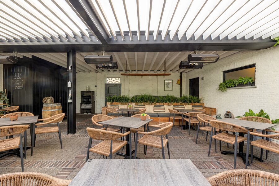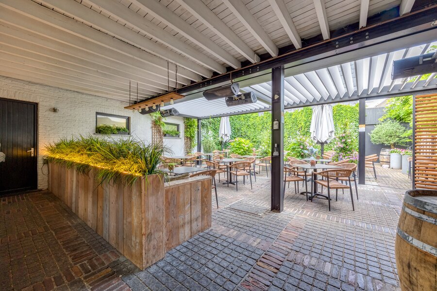 Verder is er nog een praktische berging van 19m². Buiten genieten klanten van een open terras van 80m² en een overdekt terras van 77m², wat de uitbating een ruim seizoensbereik geeft.
