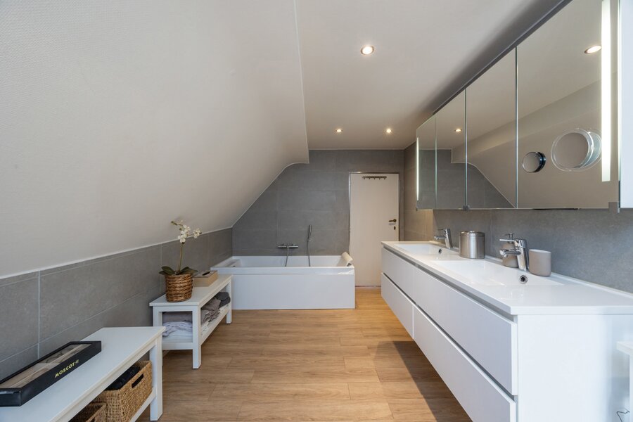 De nachthal van 6m² leidt naar de hoofdslaapkamer van maar liefst 31m² die perfect opdeelbaar is in 2 aparte kamers. Aansluitend bevinden zich een douchekamer van 5m² met inloopdouche en lavabomeubel met spiegelkasten, een ruime dressing van 20m² en een aparte badkamer van 12m² voorzien van een ligbad en dubbel lavabomeubel. De 2de slaapkamer meet 16m².