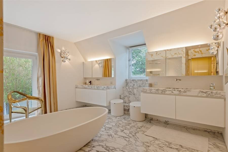 The spacious night hall gives you access to a bedroom with private bathroom, which is currently arranged as a laundry room and additional dressing room. The very spacious master suite comprises a bedroom, a dressing room with adjacent luxury bathroom. Also a second dressing room with fitted wardrobes.