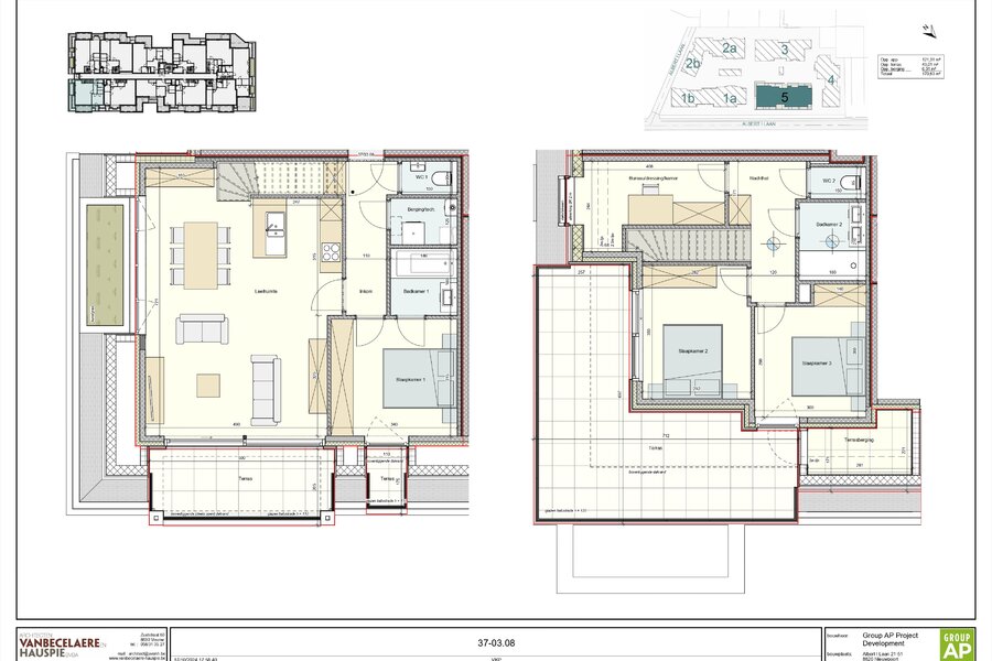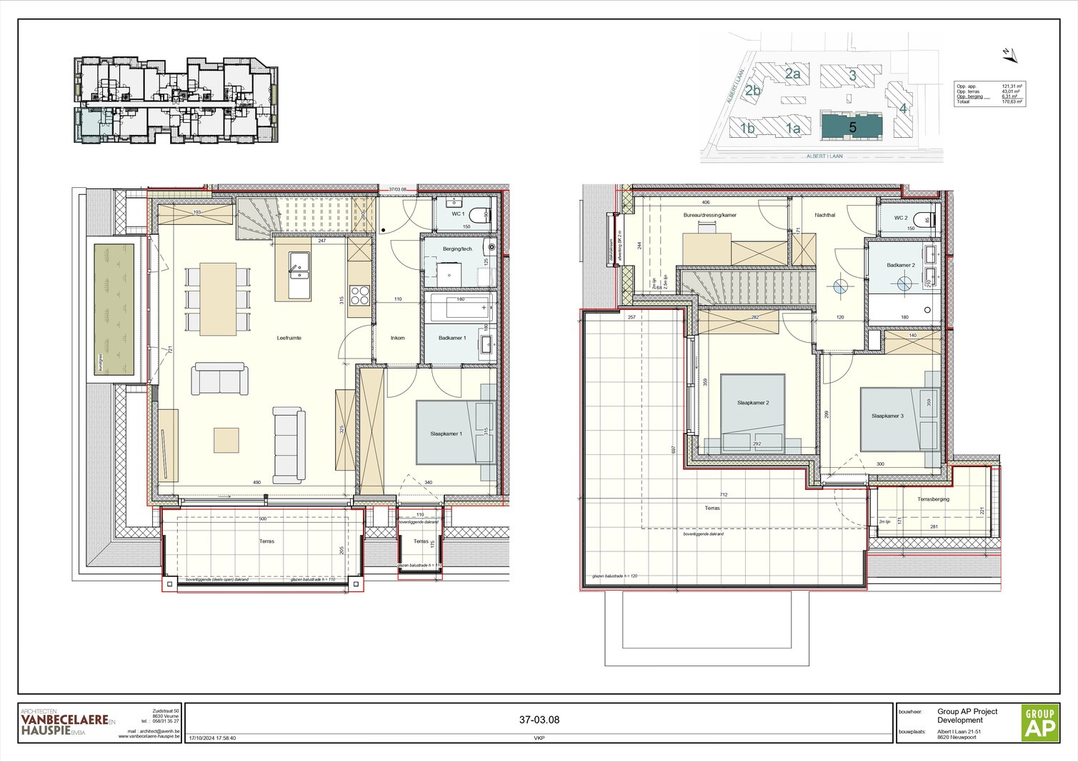 - op de 3de verdieping: Inkomhal, gastentoilet, berging met aansluiting voor wasmachine, trap, leefruimte met open keuken, zithoek, eethoek en aangrenzend terras, slaapkamer 1 met on-suite badkamer met enkele wastafel in meubel en keuze tussen ligbad, inloopdouche of hoekdouche en terras 2.