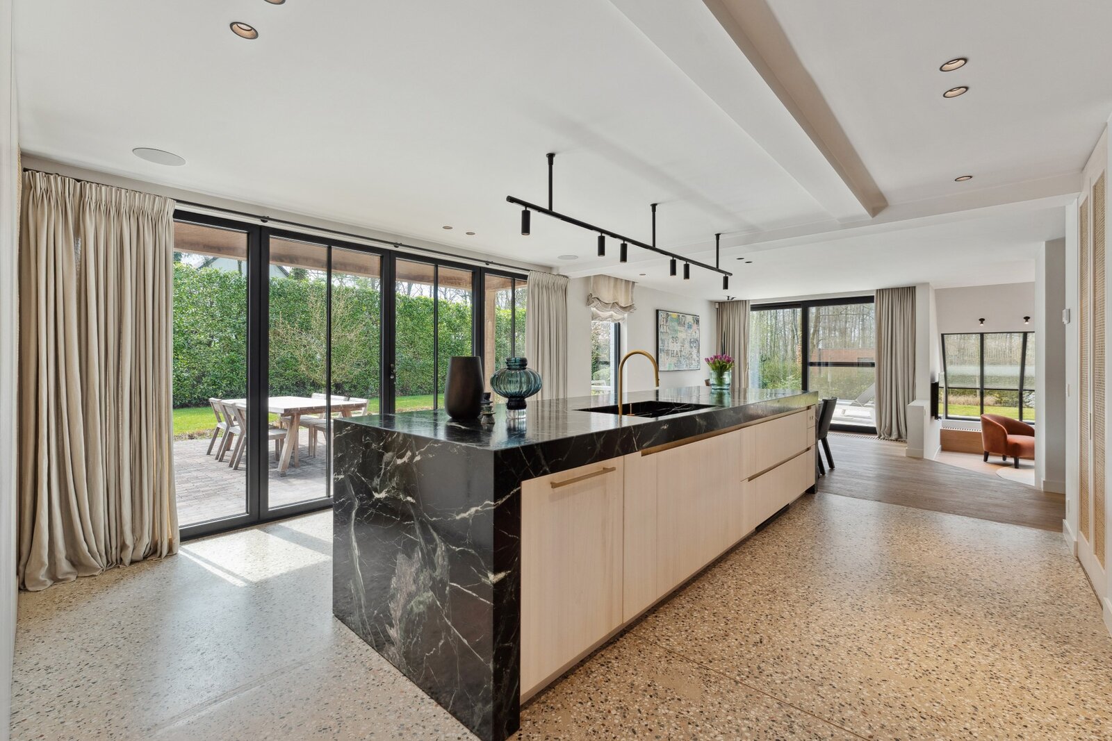 De keuken werd in 2018 compleet gerenoveerd en open getrokken, is gedeeltelijk uitgerust met terrazzo vloer en parket. Ze is zeer luxe ingericht en omvat oa een Quooker kraan, een verdoken koffiehoek, een Miele oven, vaatwasser, koelkast,... en omvat een schitterend kookeiland en verlaagde eettafel in exclusief marmer. De dubbel openslaande deur in aluminium biedt toegang tot het deels overdekt zuidterras waar u in alle privacy kunt genieten van de zon. In de sfeervolle verlaagde zit/TV- hoek op parket met hout haard kunt u heerlijk ontspannen met zicht op de tuin. Een tussensas tussen woonkamer en leefkeuken biedt eveneens toegang tot de tuin.