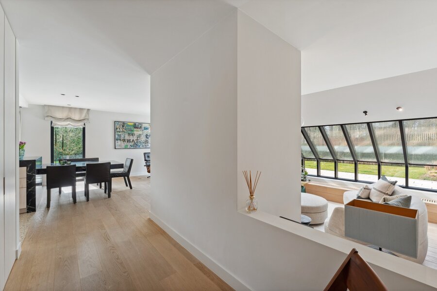 De hoofdingang aan de voorzijde van de villa biedt u een warme welkom, omgeven door elegante details en een uitnodigende sfeer. De inkomhal met gastentoilet vormt het centrale hart van deze villa die toegang biedt tot leefkeuken, woonkamer en het praktijkgedeelte. Via stalen glazen deur bereikt u de woonkamer, alsook de nieuw ingerichte leefkeuken. Vanuit alle leefruimten hebt u mooi zicht op de aangelegde tuin.