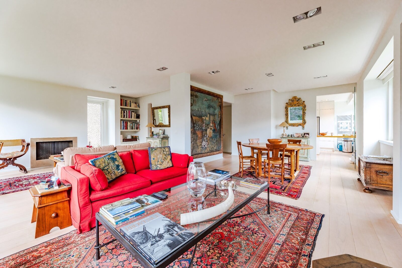 Het appartement bestaat uit een ruime hal met checkroom en gastentoilet, een eetkamer en een woonkamer met open haard en massief eiken parketvloer. De woonkamer baadt in natuurlijk licht en geeft uit op een terras van ± 40 m² op het zuidwesten. De leefruimte wordt gecompleteerd door een volledig uitgeruste keuken met ontbijthoek, een wasruimte en grote kasten.