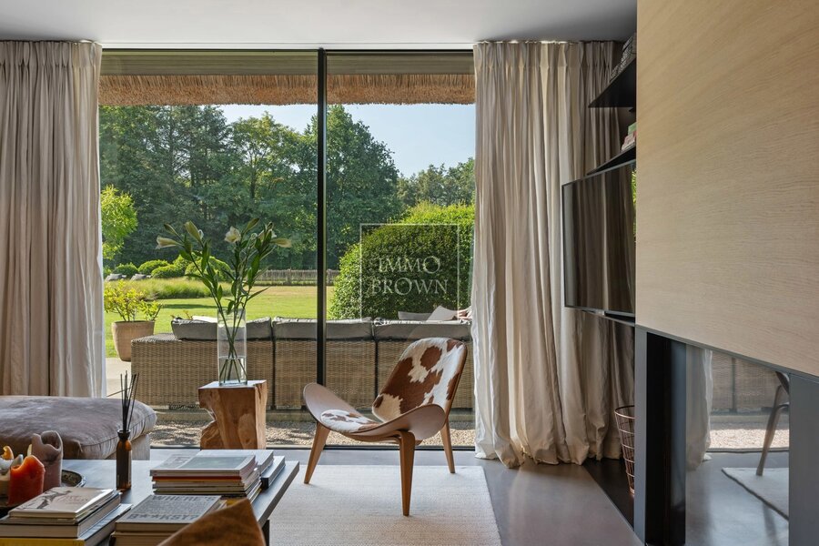 What makes this villa truly exceptional is the outdoor experience. The garden seamlessly merges into the natural domain, creating an oasis of peace and privacy. At the center of the garden lies a natural swimming pool, filtered in an ecological way. The adjoining poolhouse offers a luxurious space to relax, with views of the greenery and complete privacy.