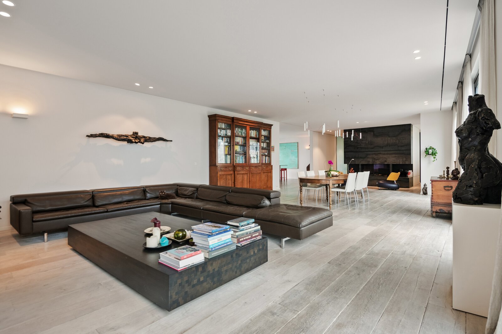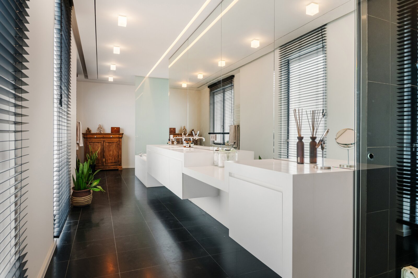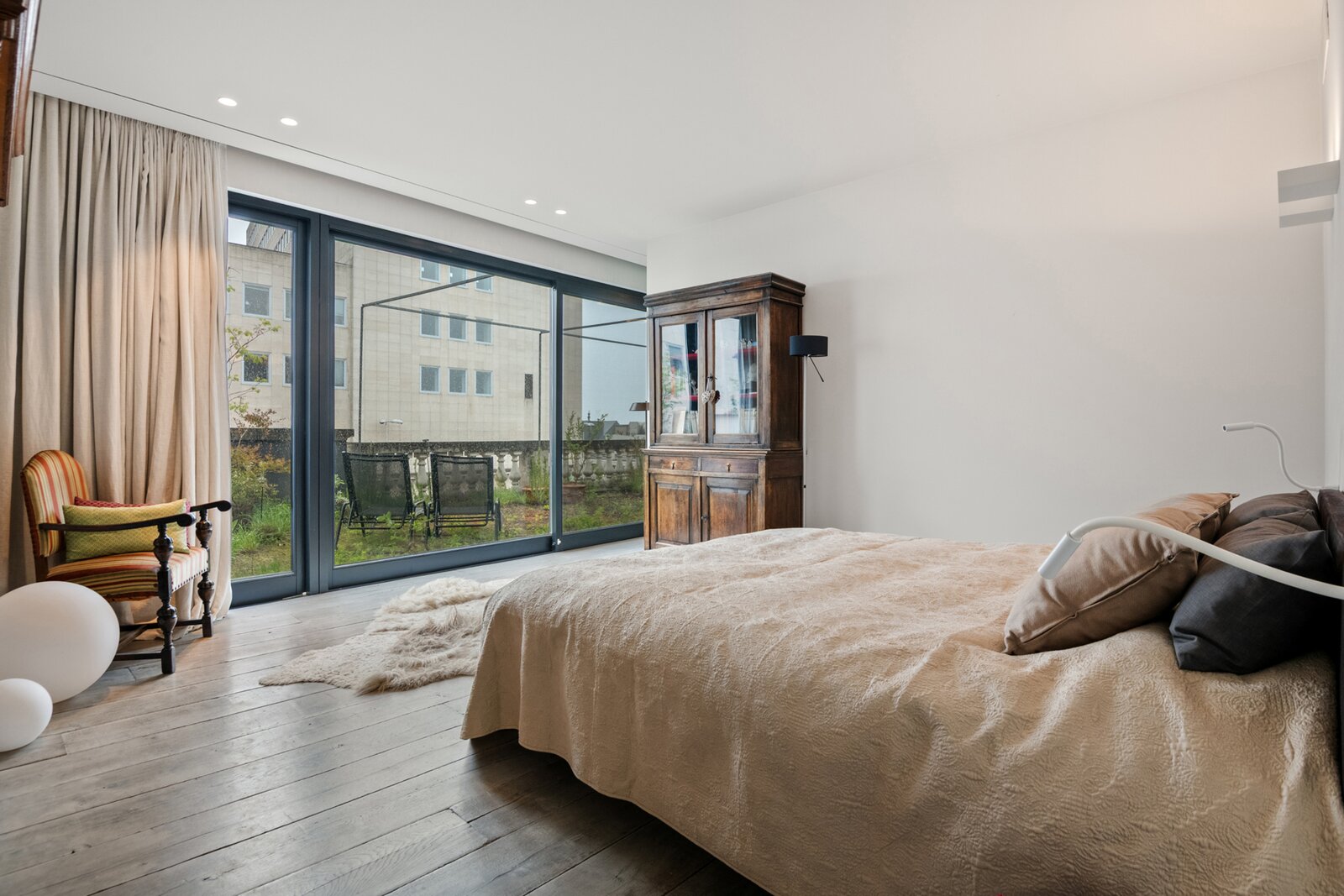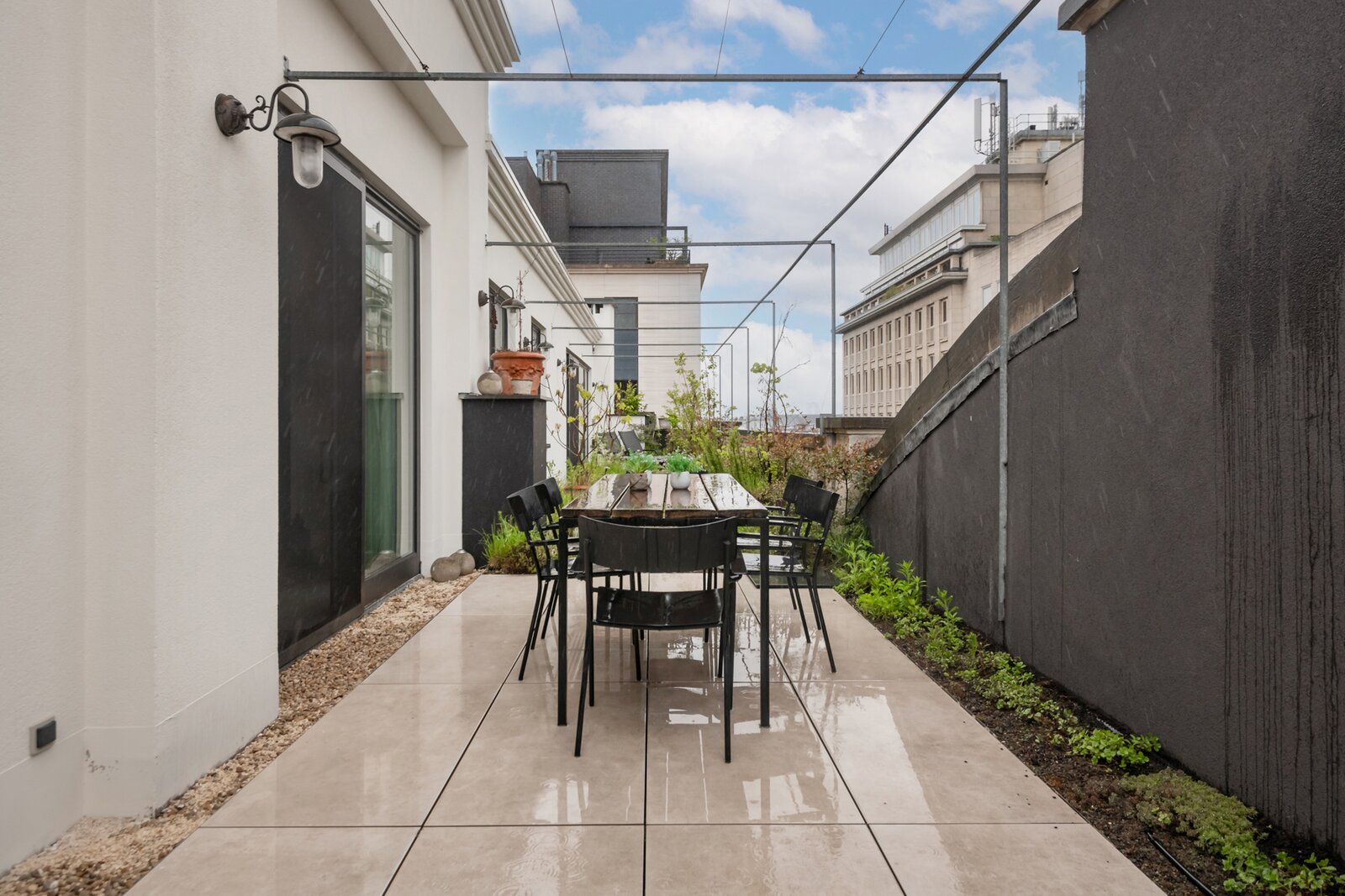 Right in the city centre, we find this exceptional duplex penthouse on the third and fourth floors of a building full of character. The impressive façade and authentic entrance hall in eclectic/baroque style are beautifully preserved and immediately set the tone when entering the property. A private lift takes you straight into the penthouse entrance hall, equipped with a cloakroom and guest toilet. The generous living space on wooden floors radiates warmth and class, with an atmospheric fireplace clad in cold-rolled steel as an eye-catcher. The open kitchen was renovated in 2016 and equipped with a stainless steel worktop and all contemporary appliances, perfect for those who like to cook in style. This floor also houses a spacious technical storage room, an office corner, a currently equipped gym, as well as the master bedroom with ensuite bathroom, built-in dressing room. The fourth floor further offers access to the beautiful terraces of around 200m² in total, a rare asset in the city. The ground floor, accessible via an internal staircase, offers another three full-size bedrooms, a shower room with washbasin, and two practical storage rooms. In 2016, the property was also fitted with updated electricity and a home automation system for lighting. Furthermore, an extremely spacious garage box can be purchased with additional storage space and room for as many as three cars. This does not include the asking price (€80,000).