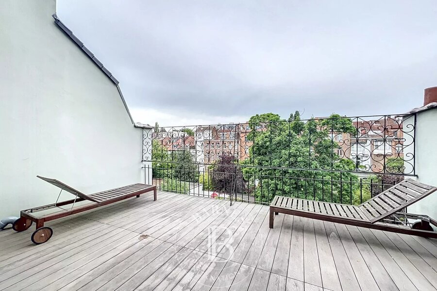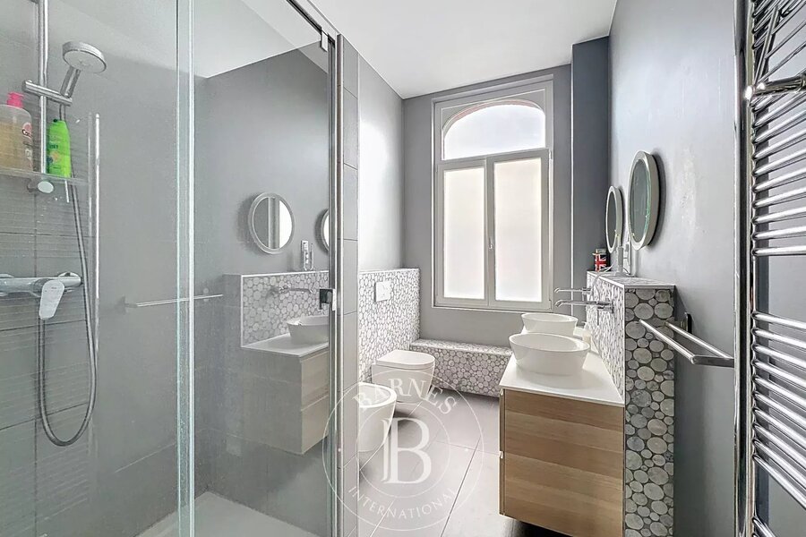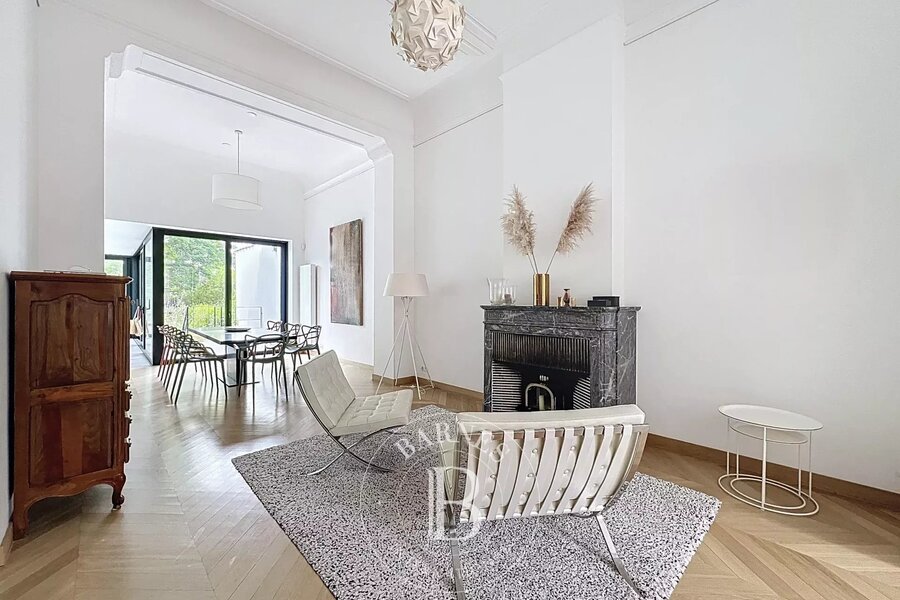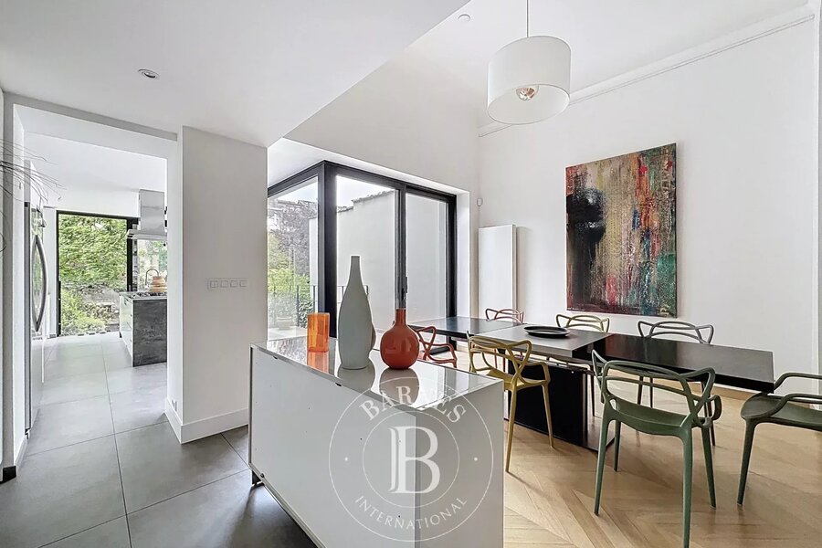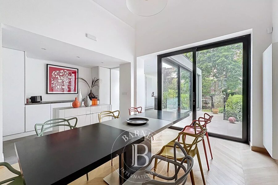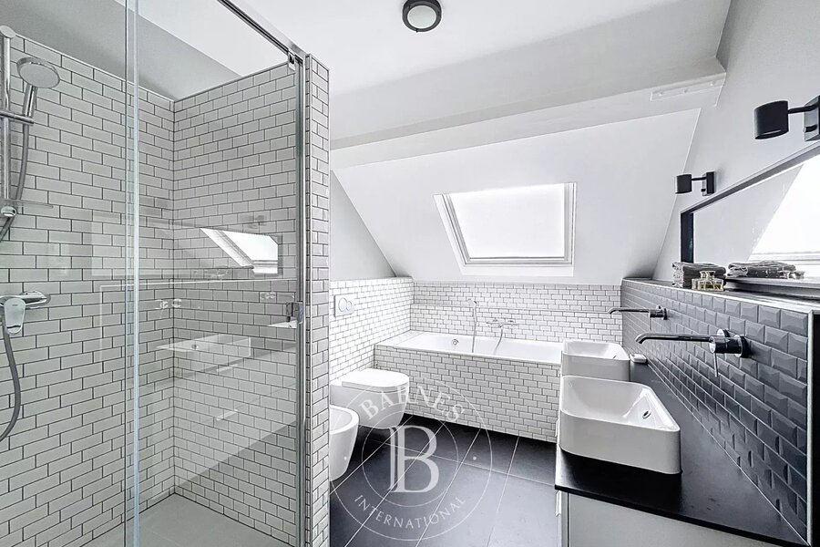 On the garden level, a multi-purpose room with bathroom (room for a nanny, games room, sports room, etc.) with access to an English courtyard and garden. There's also a wine cellar, laundry room and ample space for bicycles.