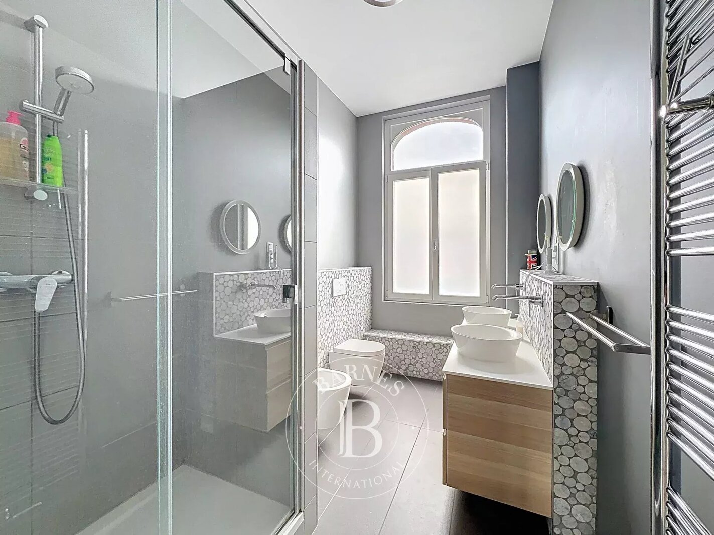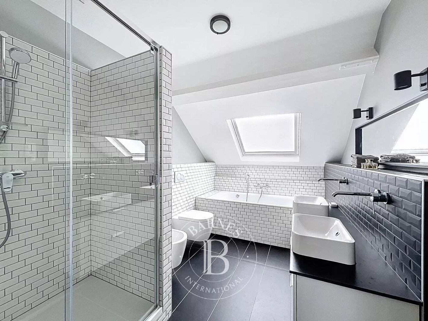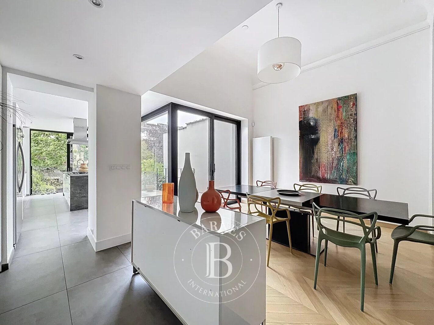 On the garden level, a multi-purpose room with bathroom (room for a nanny, games room, sports room, etc.) with access to an English courtyard and garden. There's also a wine cellar, laundry room and ample space for bicycles.