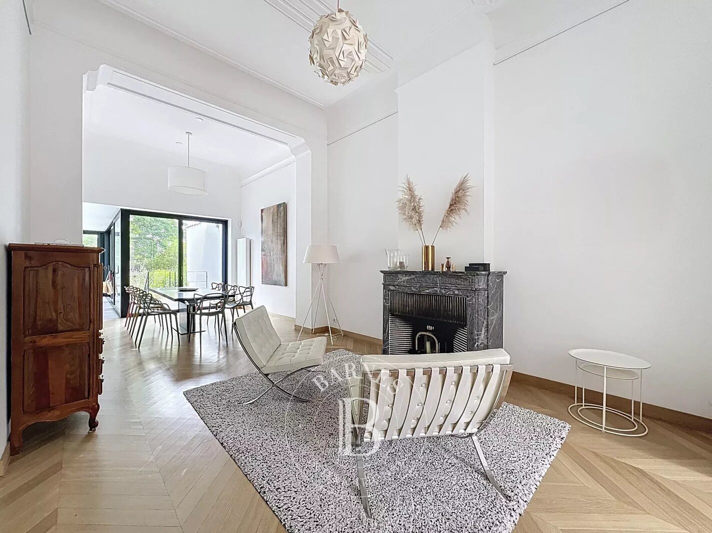On the first floor, a double living room, a dining room, a kitchen with a central island and a pantry opening onto a pretty garden.