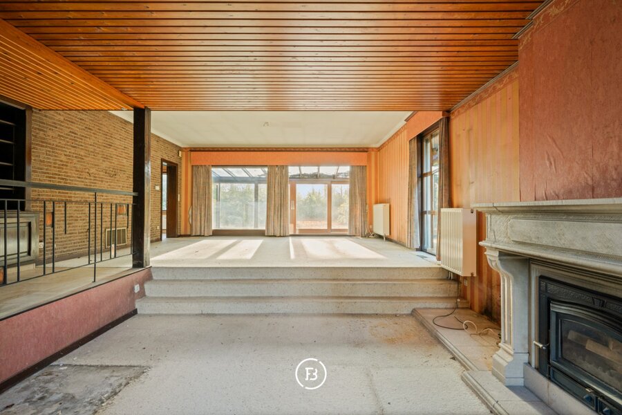De bestaande woning is volledig gelijkvloers met een ruime living met open haard, 3 slaapkamers, keuken, toilet, badkamer en een mooie verbinding naar de grote tuin via een gezellige veranda.
