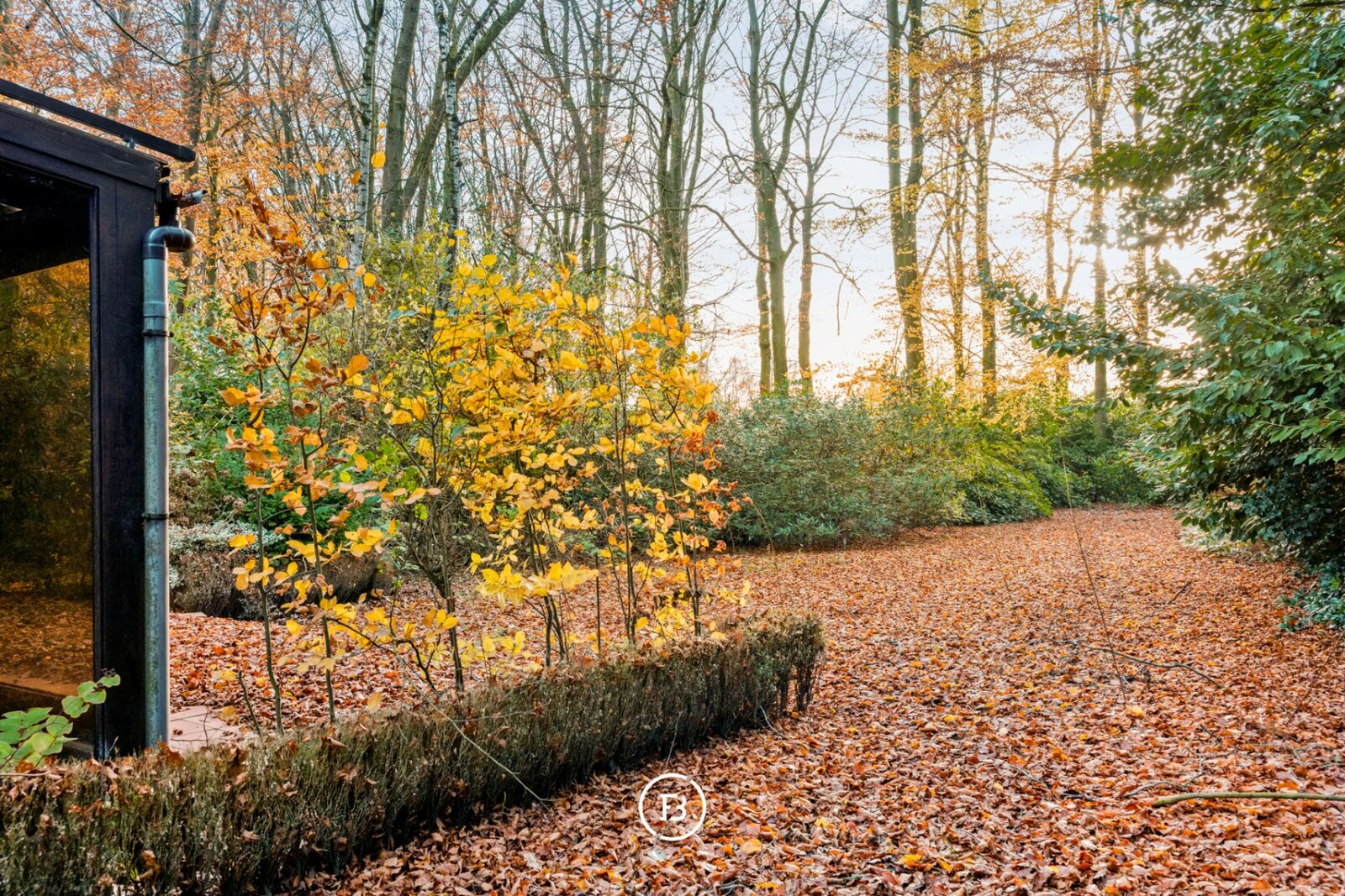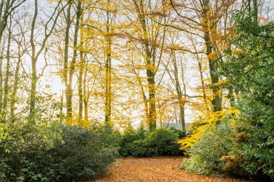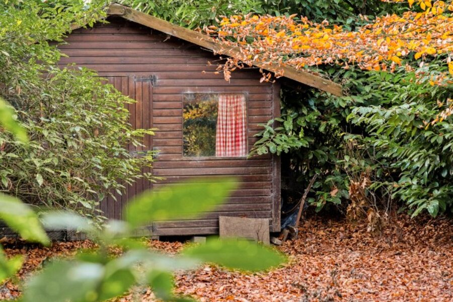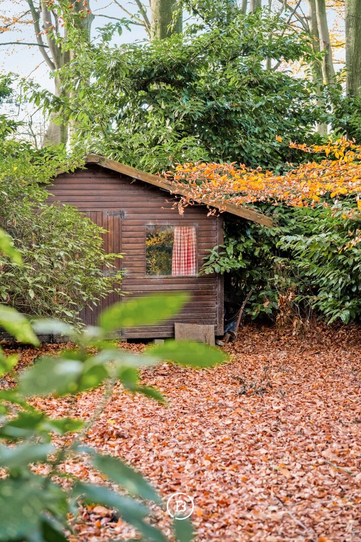 Een tuinhuis en houtopslag zit mooi verborgen tussen de bomen.