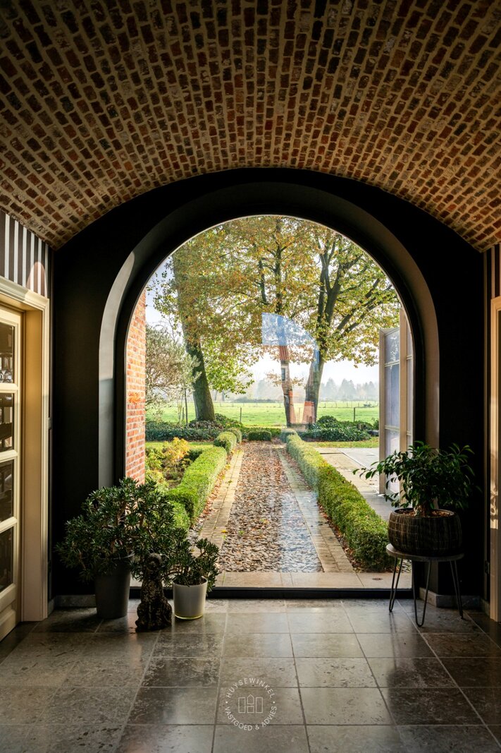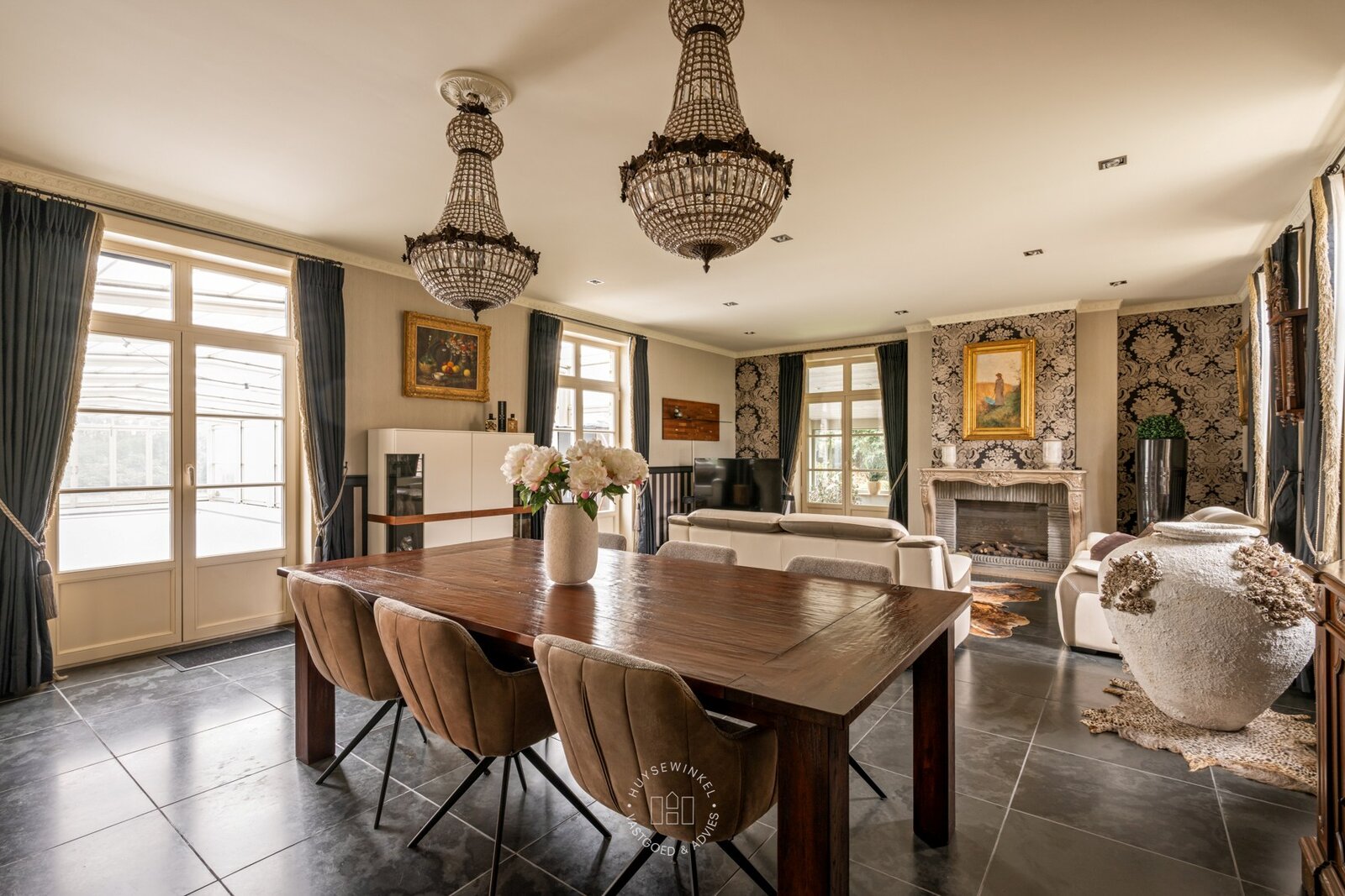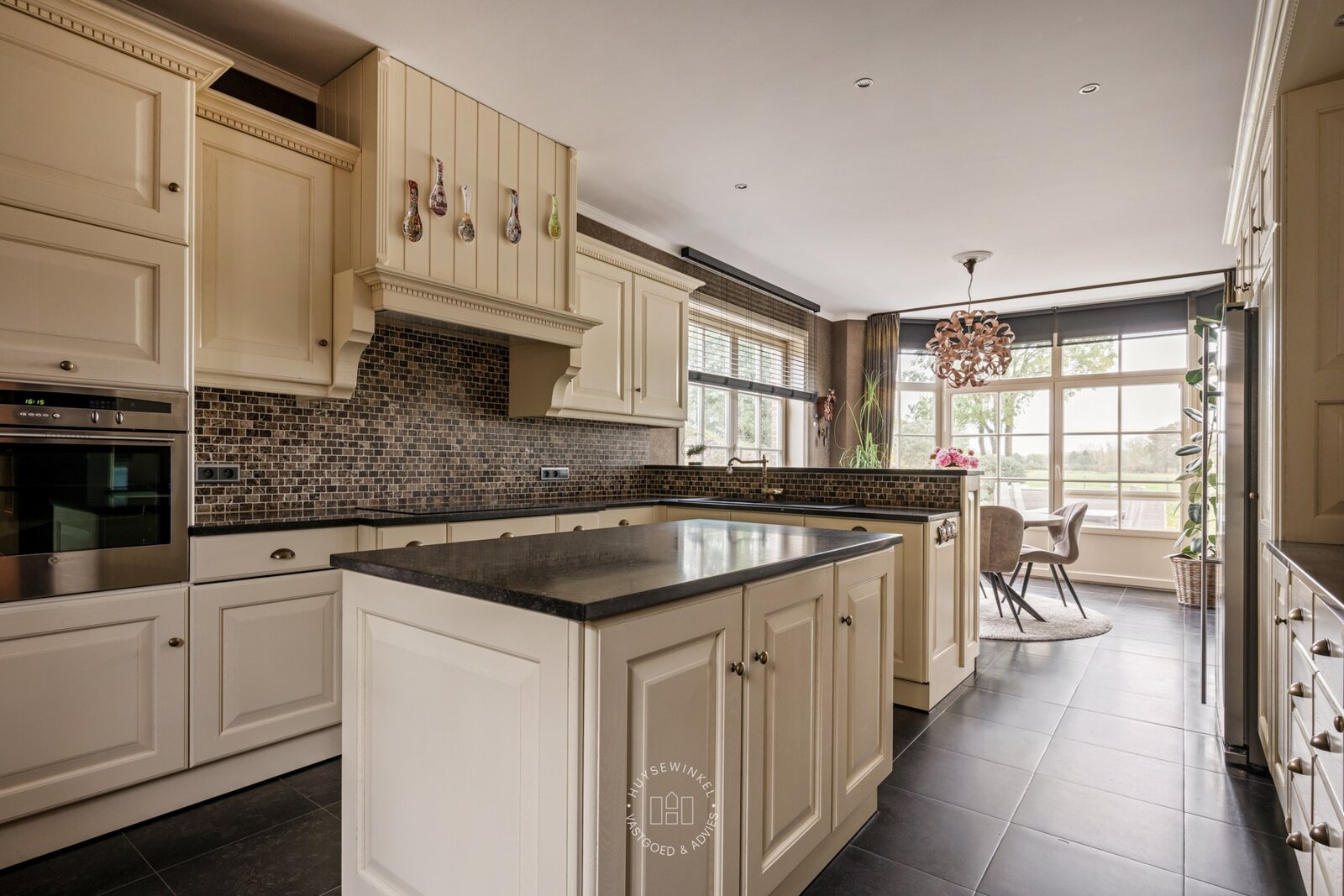 Bij het binnenkomen via de koetsiersgang treft u links de traphal met gastentoilet en een volledig uitgeruste keuken met gezellige ontbijthoek die uitkijkt over de tuin en achterliggende velden. Aansluitend bevindt zich de eetkamer, perfect voor sfeervolle familiemomenten.