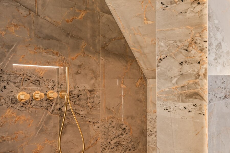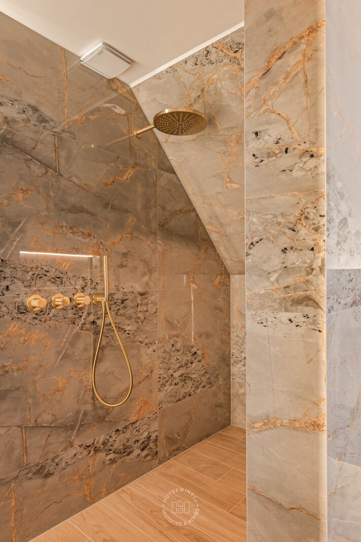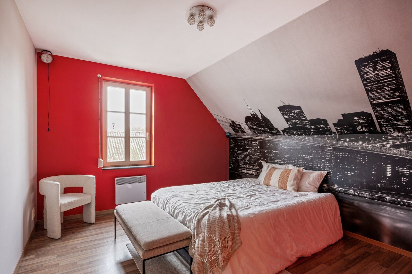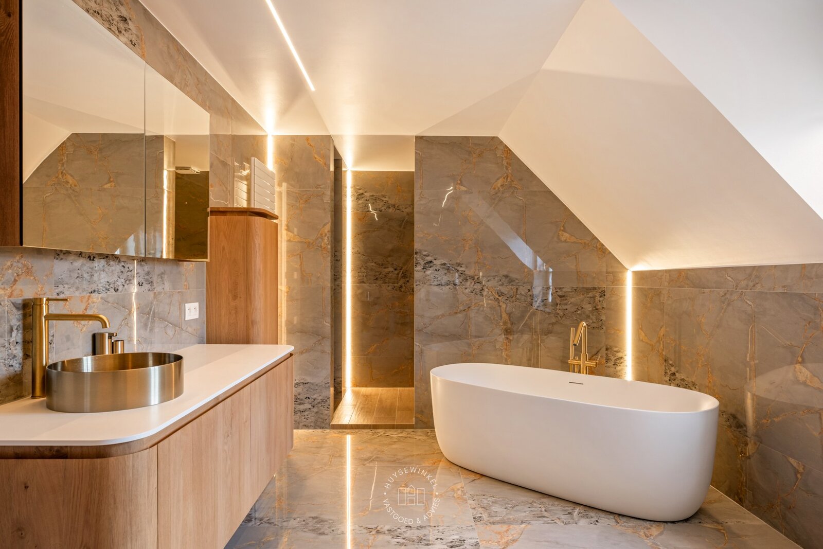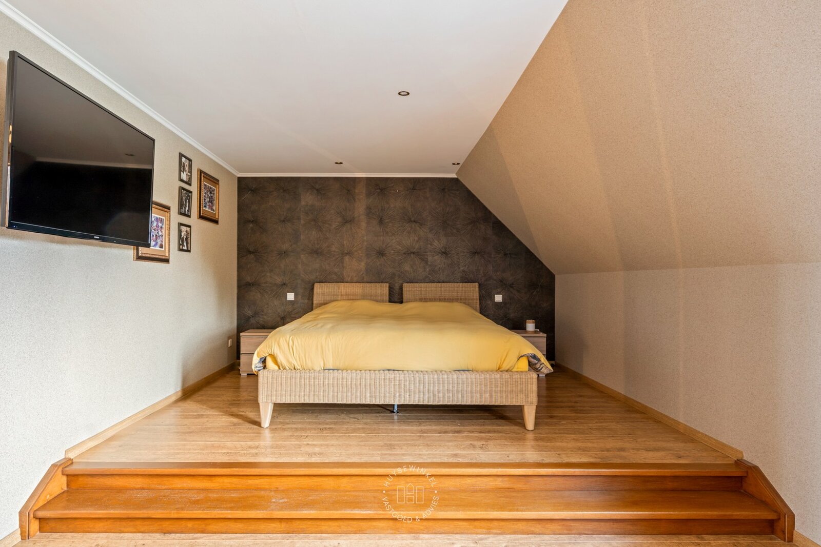 Op de verdieping zijn er vier slaapkamers, waaronder een master bedroom met dressing en luxe badkamer voorzien van dubbele lavabo, ligbad, inloopdouche en toilet. De kinderkamers delen een tweede badkamer. Een vaste trap leidt tot de ruime zolder, ideaal als extra opslagruimte.