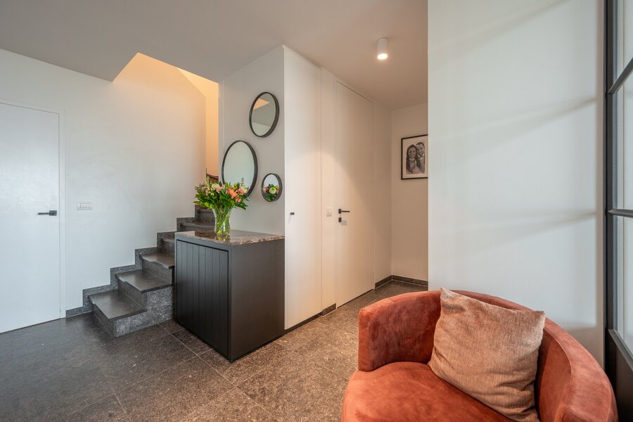 De riante leefruimte, afgewerkt met een gashaard, sluit mooi aan op de grote leefkeuken en eetplaats. Aansluitend bevinden zich een praktische berging, een ruime inkomhal met gastentoilet en een royale vestiaire. Op dit niveau ligt ook de master bedroom, uitgerust met dressing en eigen badkamer.