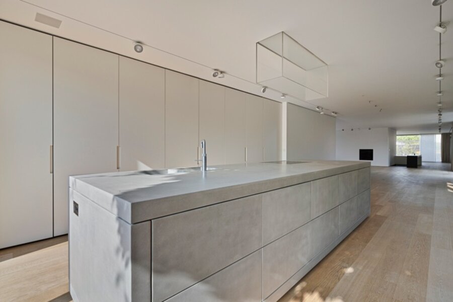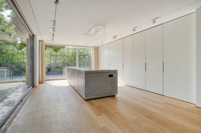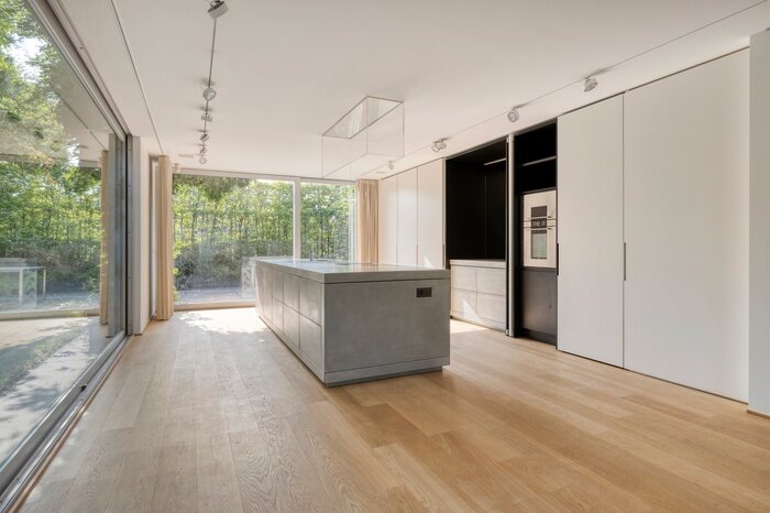 De designkeuken is opgevat rond een centraal eiland met geïntegreerde spoelbak en kookplaat, omgeven door elegante kasten. Hoge schuiframen laten binnen en buiten naadloos in elkaar overvloeien en geven rechtstreeks toegang tot het terras en de tuin.