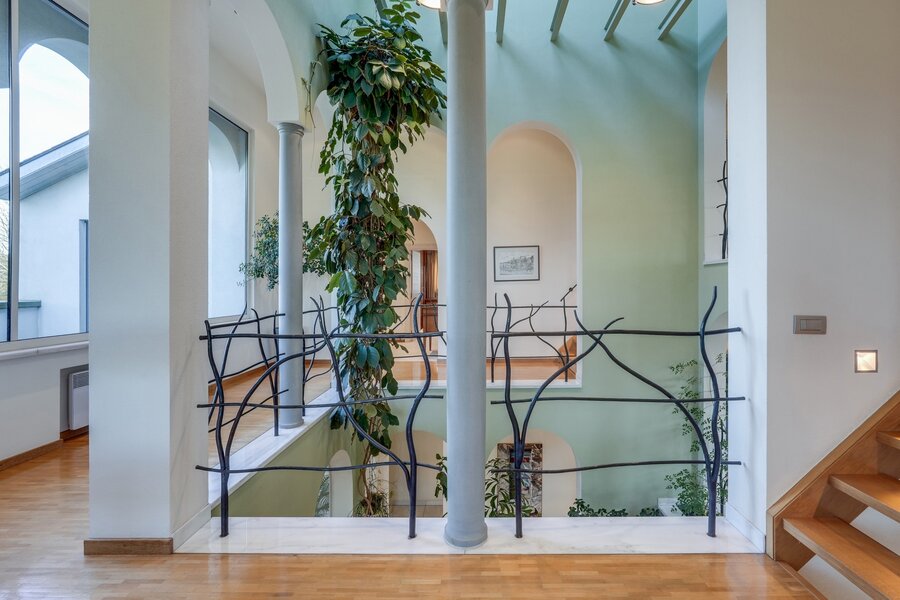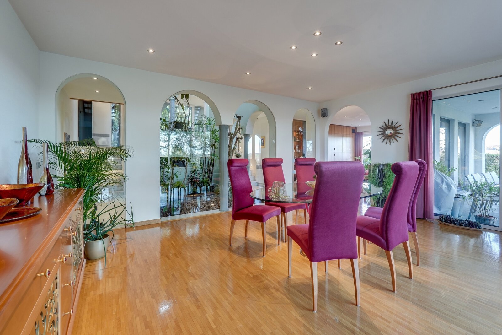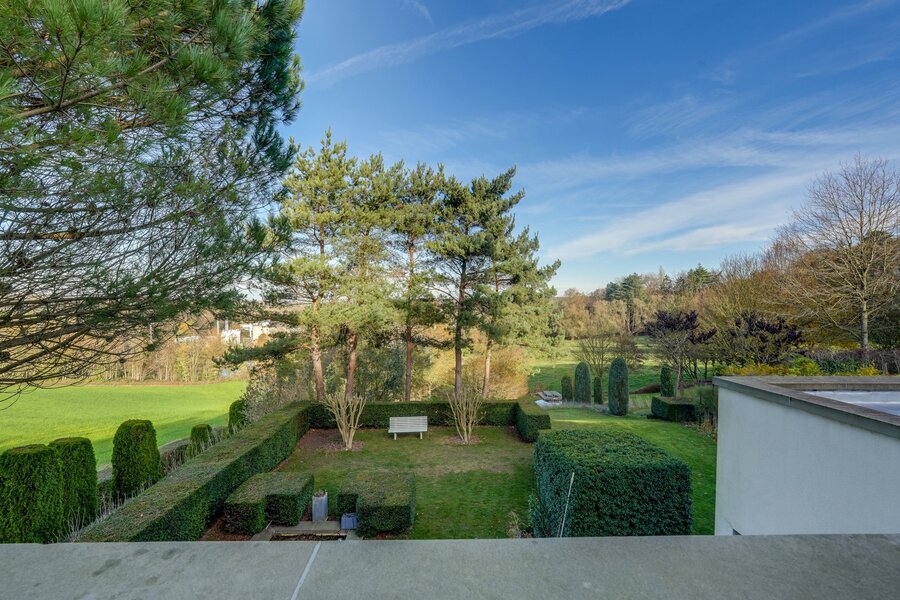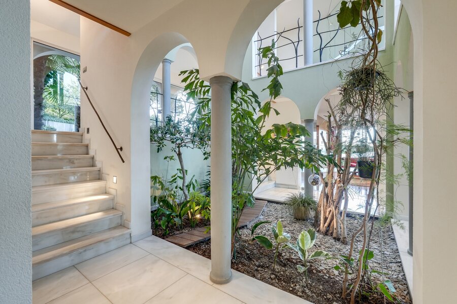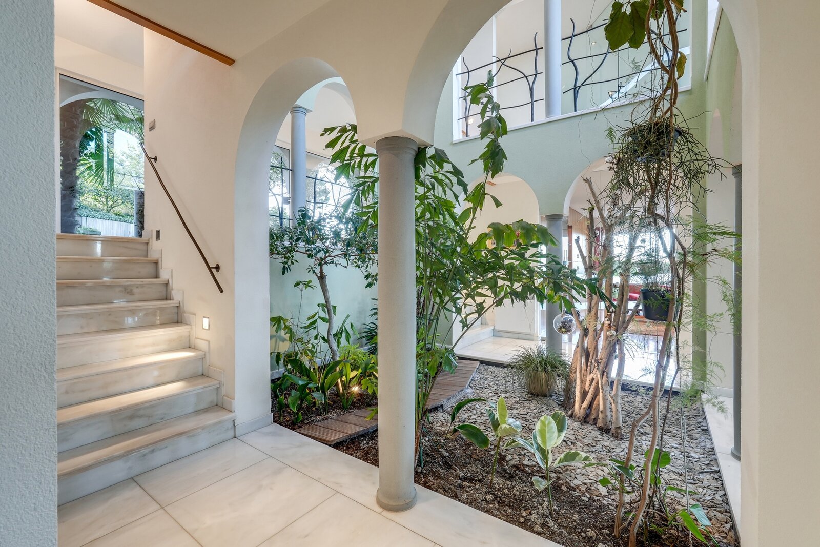 Organised around a light-filled central atrium, the villa is composed of split levels that bring volume and fluidity to the spaces. The marble entrance hall leads to a study and superb reception rooms: a refined lounge with an open fire and bespoke library, an elegant dining room, and a high-end kitchen with a central island and breakfast area, extended by one of the terraces offering a soothing view of the garden.