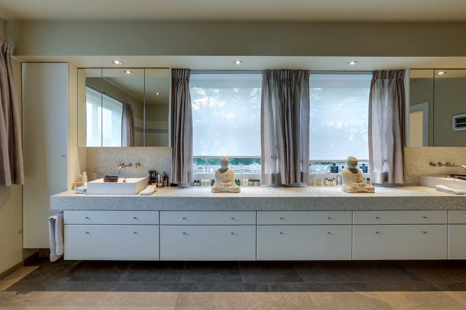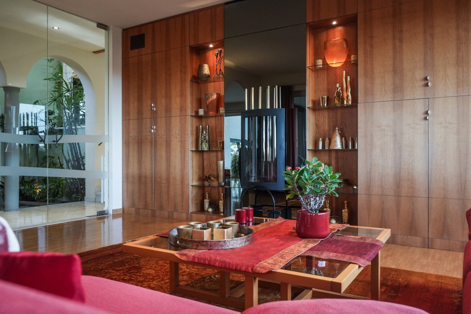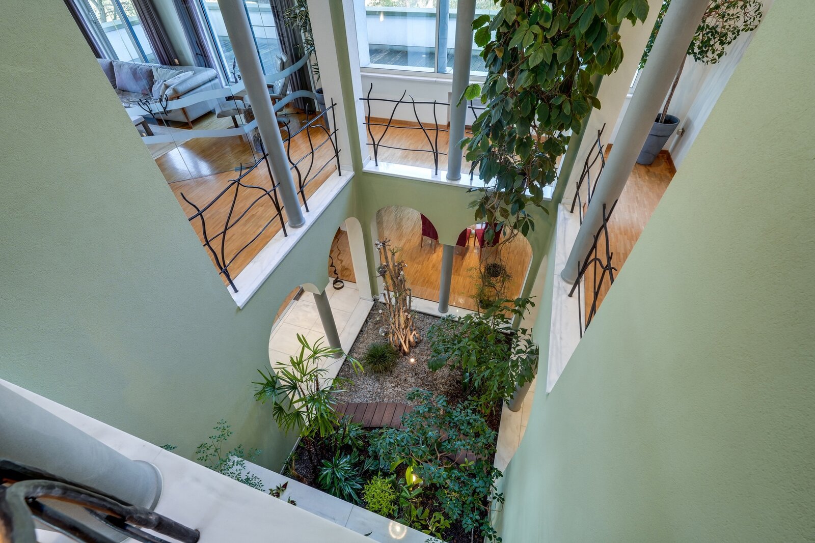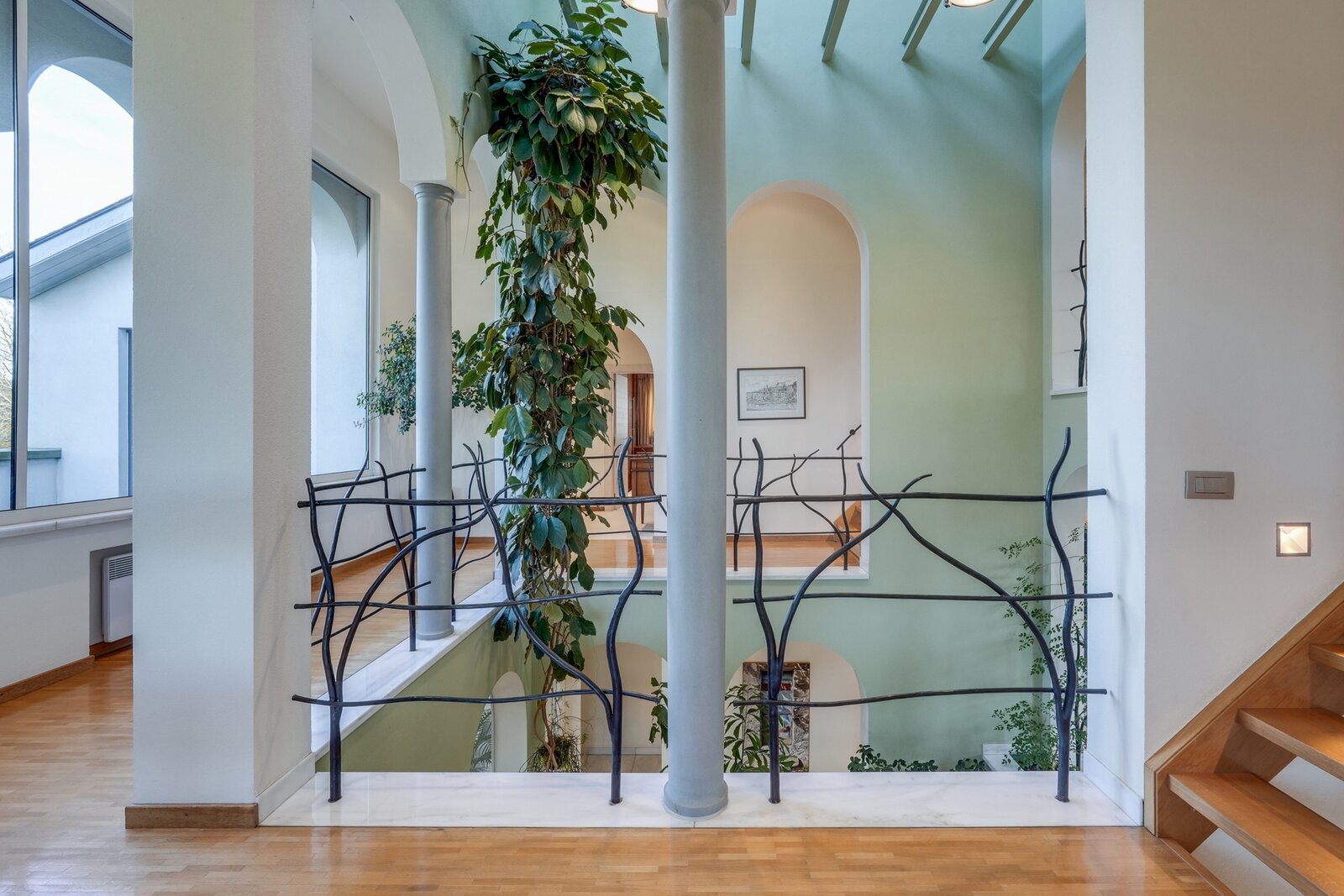 Organised around a light-filled central atrium, the villa is composed of split levels that bring volume and fluidity to the spaces. The marble entrance hall leads to a study and superb reception rooms: a refined lounge with an open fire and bespoke library, an elegant dining room, and a high-end kitchen with a central island and breakfast area, extended by one of the terraces offering a soothing view of the garden.