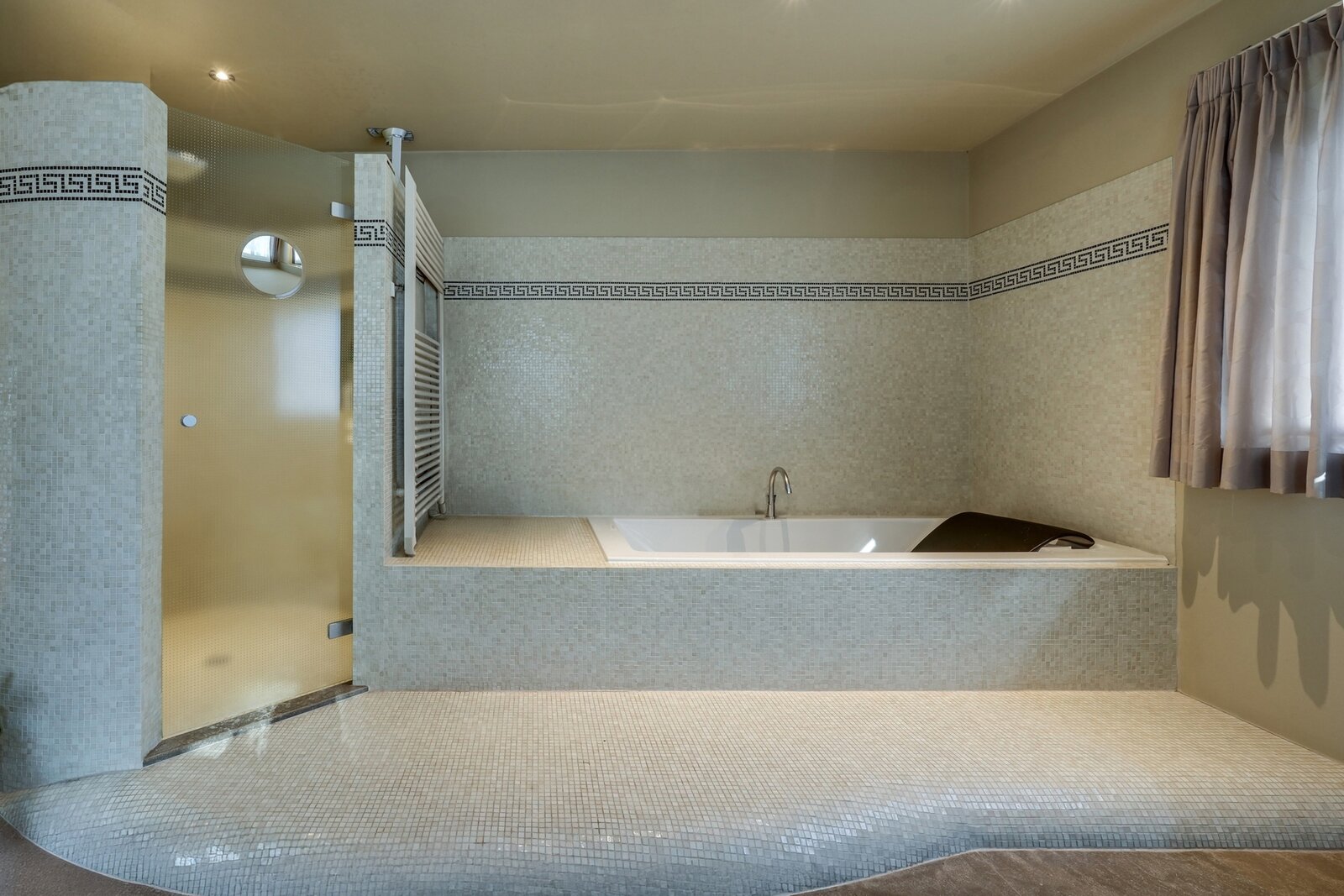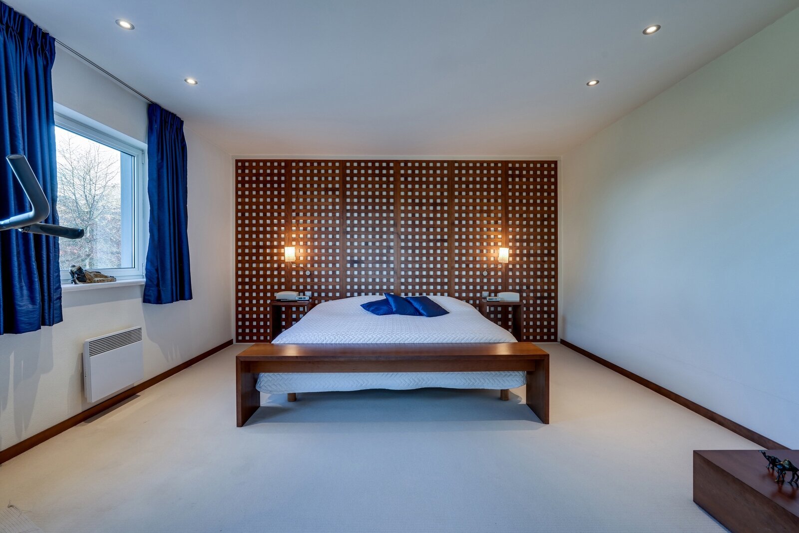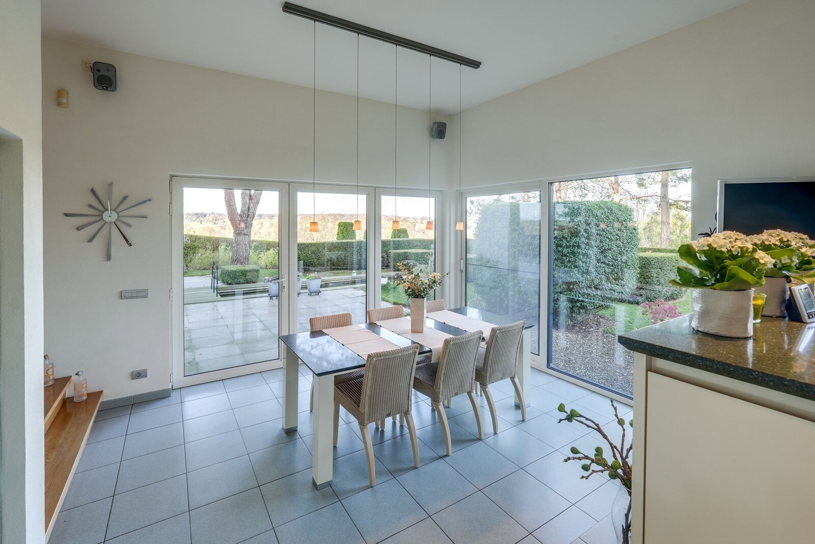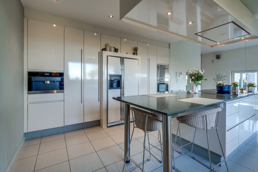 Organised around a light-filled central atrium, the villa is composed of split levels that bring volume and fluidity to the spaces. The marble entrance hall leads to a study and superb reception rooms: a refined lounge with an open fire and bespoke library, an elegant dining room, and a high-end kitchen with a central island and breakfast area, extended by one of the terraces offering a soothing view of the garden.