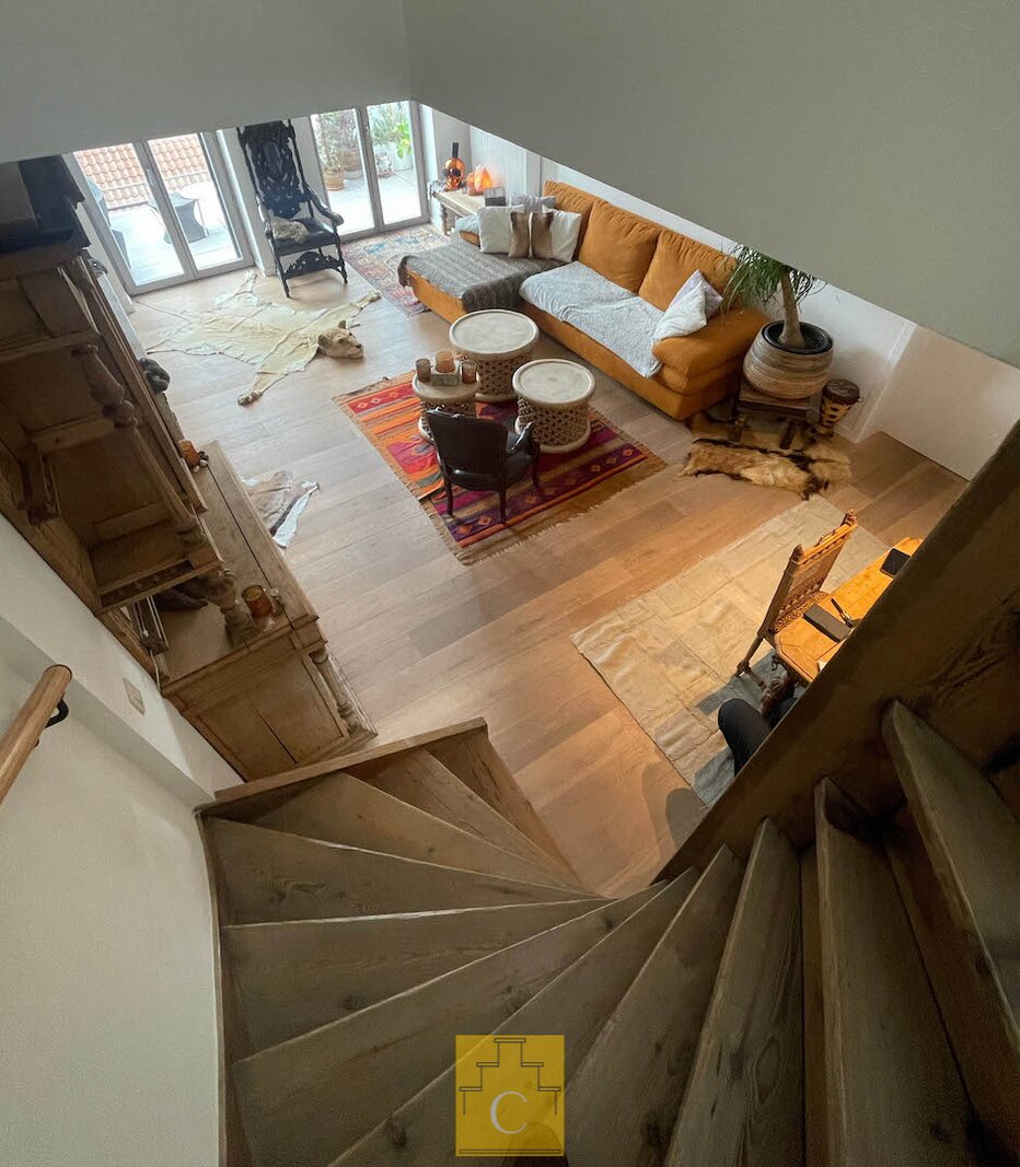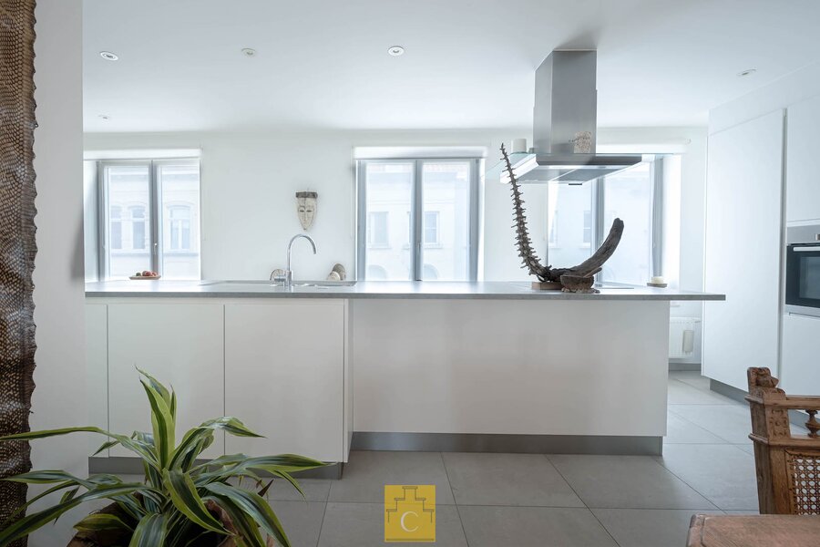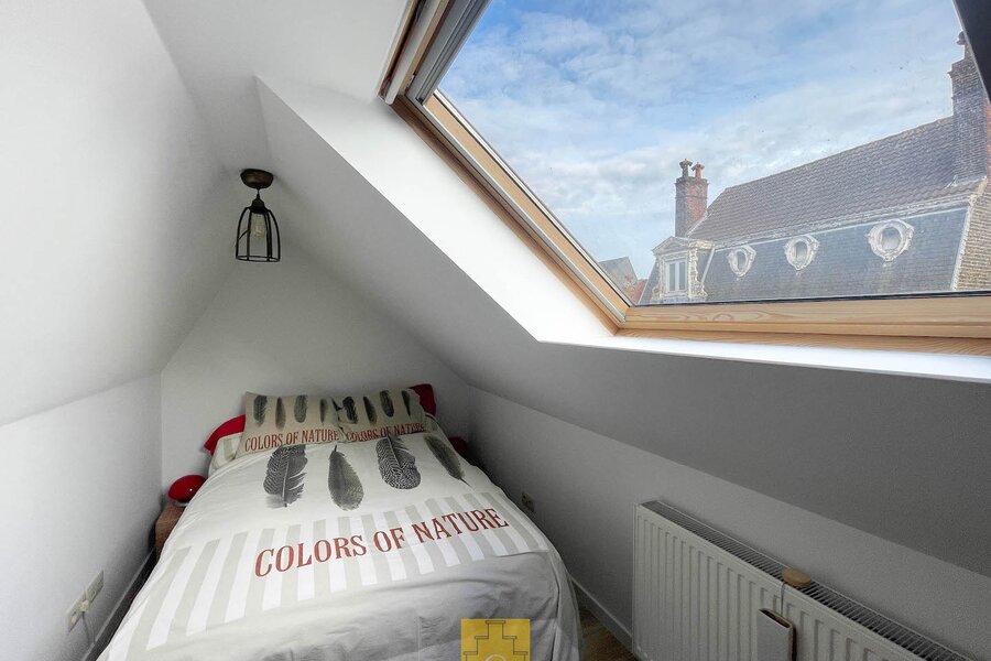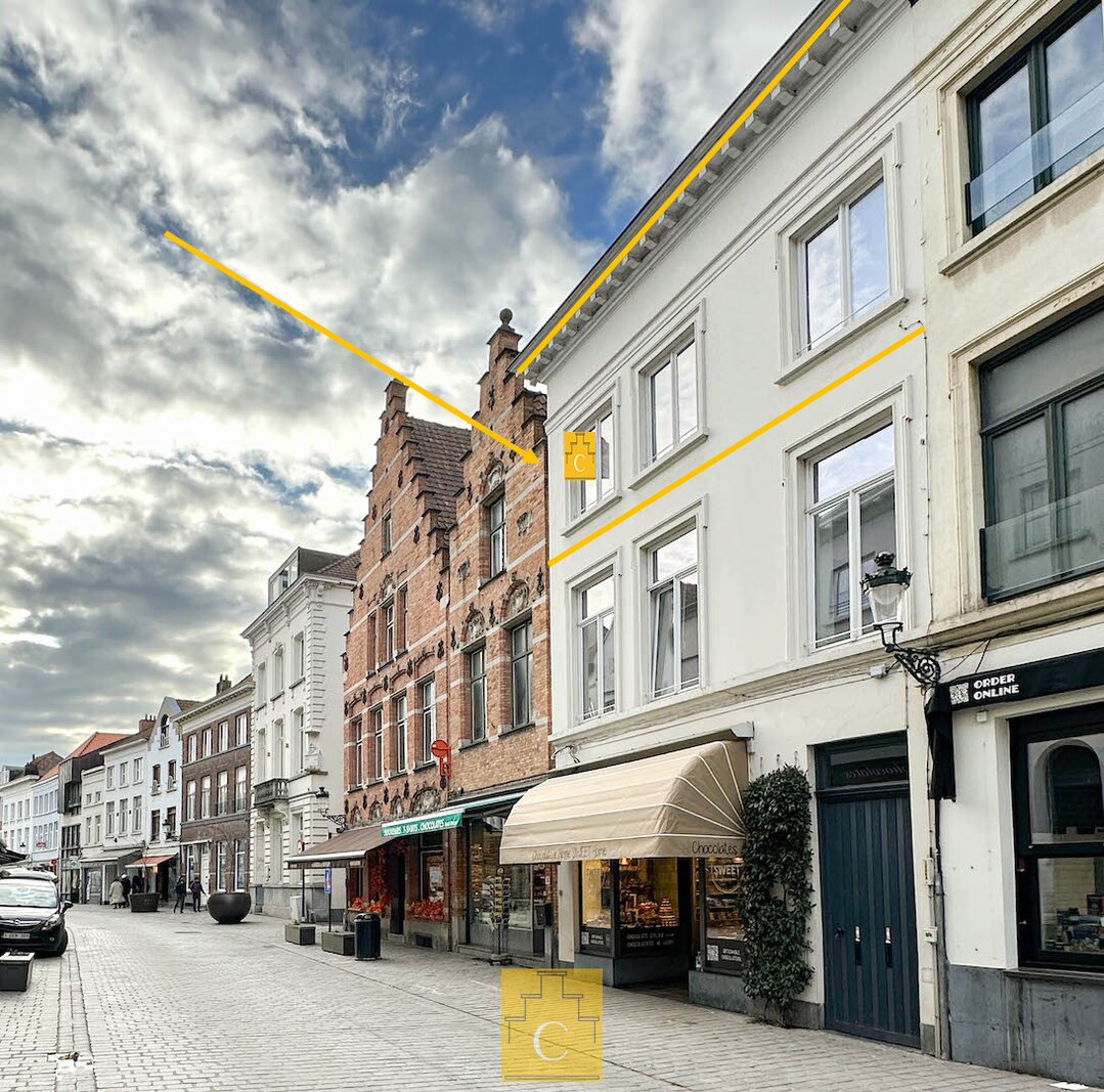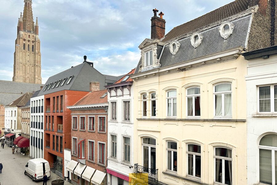 In dit stijlvol herenhuis (bouwjaar 1835) werden in 2016 onder de deskundige leiding van architect Salens 2 royale appartement gecreëerd. Een kleine residentie dus – zonder syndicus – met op het gelijkvloers een winkel. De inkomhal en de gemene delen van het gebouw hebben niets van hun authenticiteit verloren. Er is een ruime lift en je woont helemaal bovenaan (wat kan je meer dromen). Het duplex-appartement heeft een woonoppervlakte van circa 117 m2 en geniet van een perfecte lichtinval en grandioze uitzichten, zowel vooraan (Onze-Lieve-Vrouwkerk) als achteraan (het Walplein en het dakenspel rond het Minnewater).Het werd smaakvol en tijdloos ingericht.