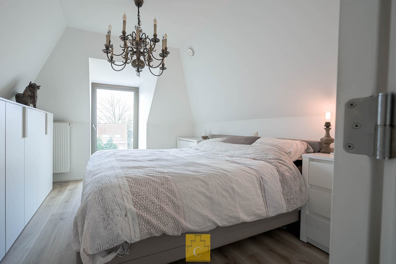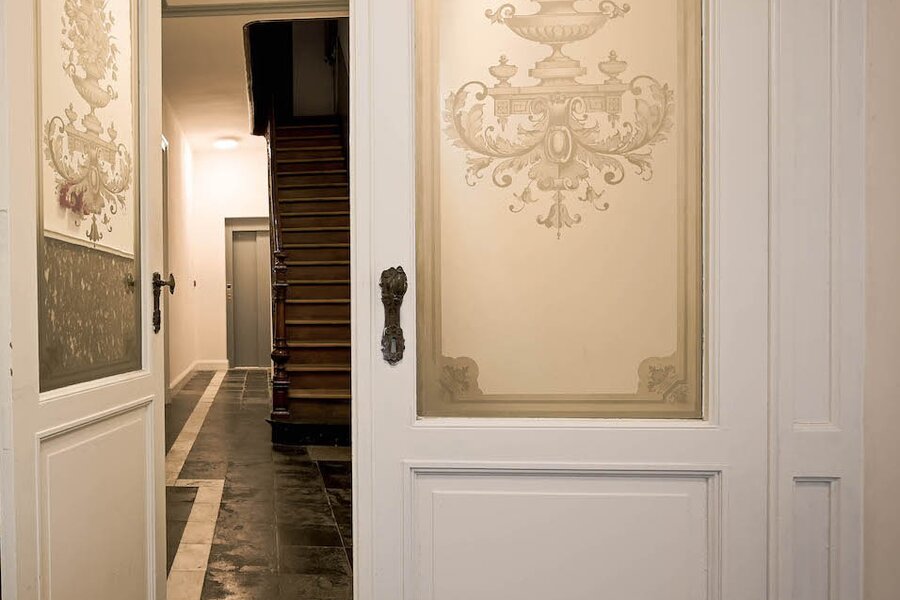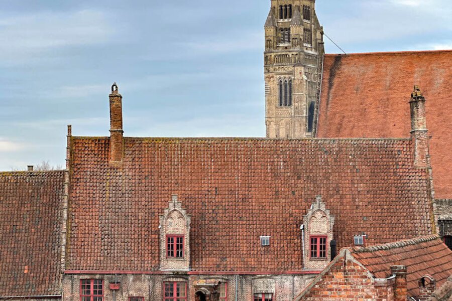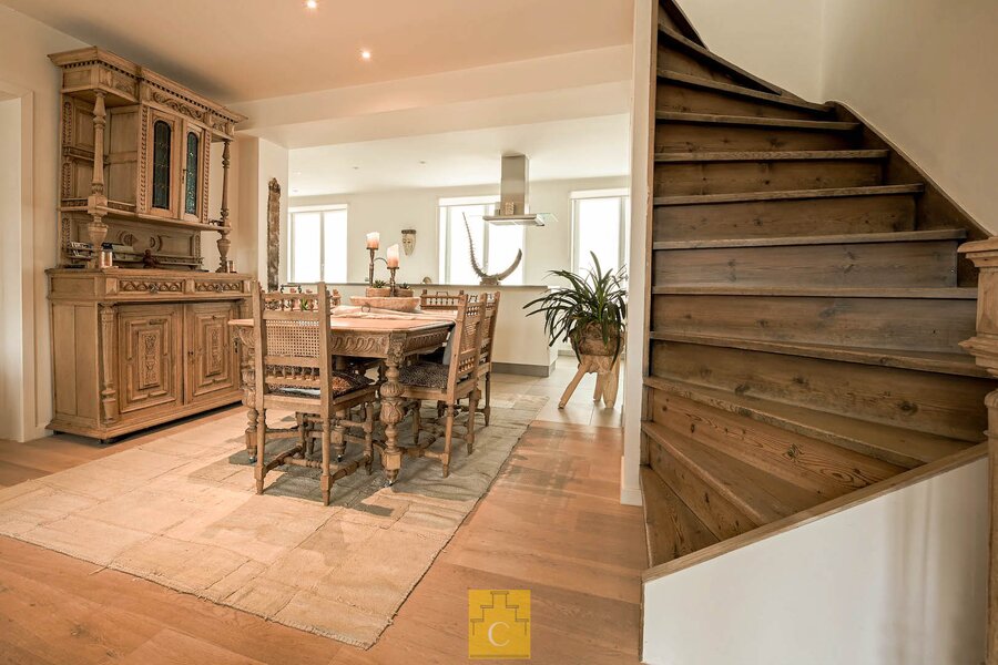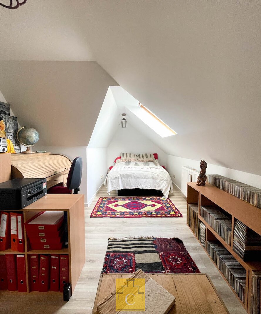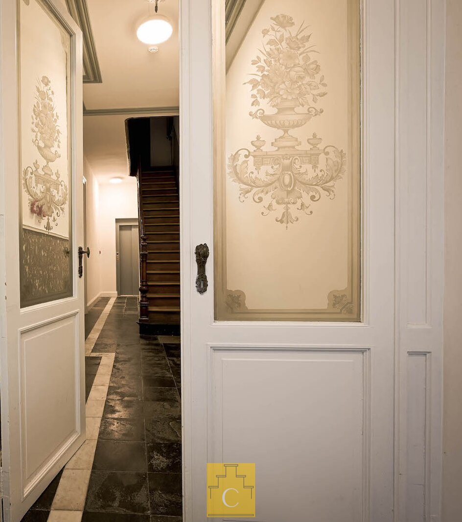 In dit stijlvol herenhuis (bouwjaar 1835) werden in 2016 onder de deskundige leiding van architect Salens 2 royale appartement gecreëerd. Een kleine residentie dus – zonder syndicus – met op het gelijkvloers een winkel. De inkomhal en de gemene delen van het gebouw hebben niets van hun authenticiteit verloren. Er is een ruime lift en je woont helemaal bovenaan (wat kan je meer dromen). Het duplex-appartement heeft een woonoppervlakte van circa 117 m2 en geniet van een perfecte lichtinval en grandioze uitzichten, zowel vooraan (Onze-Lieve-Vrouwkerk) als achteraan (het Walplein en het dakenspel rond het Minnewater).Het werd smaakvol en tijdloos ingericht.