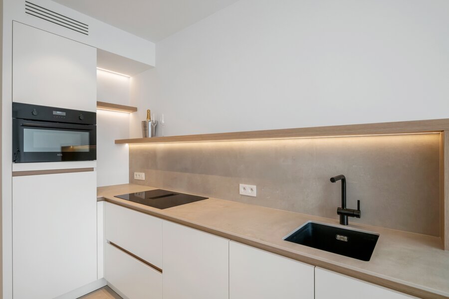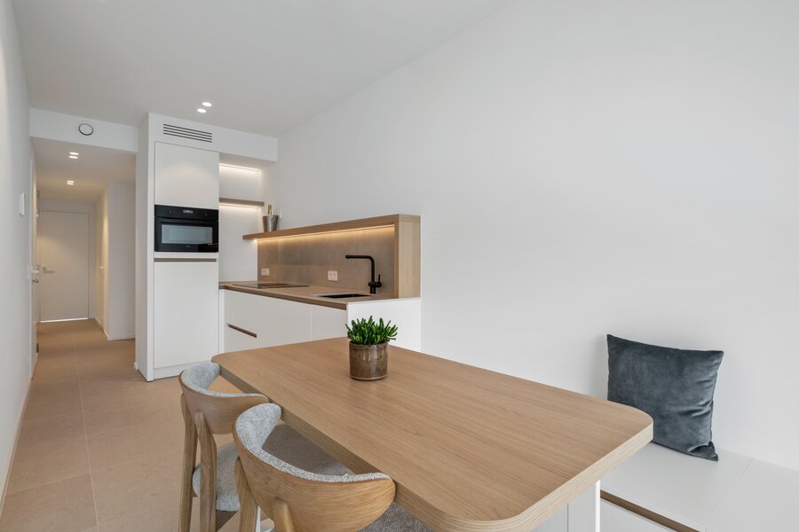 This beautifully finished apartment features an entrance hall with cloakroom, leading into the bright and elegantly designed living area. The lounge flows seamlessly onto the sunny terrace, creating a pleasant and inviting living environment.