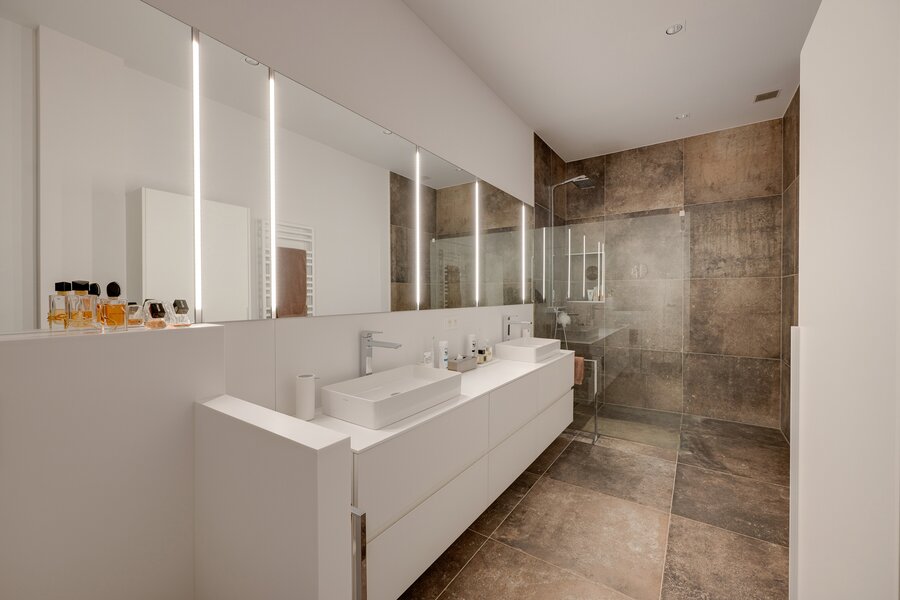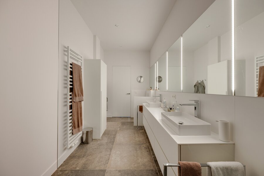 Doorheen de hele loft zorgen maatkasten tot aan het plafond voor een perfect gevoel van orde en ruimte. De eiken parketvloer brengt warmte en karakter in het interieur en vormt een harmonieus geheel met de moderne uitstraling van het appartement.