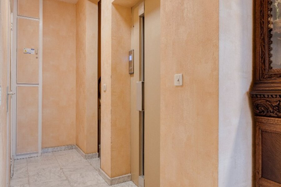 Via de centrale nachthal bereikt u de drie volwaardige slaapkamers. De badkamer is uitgerust met zowel een douche als een ligbad. Daarnaast beschikt het appartement over een praktische strijkkamer met maatkasten en aansluitingen voor wasmachine en droogkast, aangevuld met een tweede berging voor extra stockage.