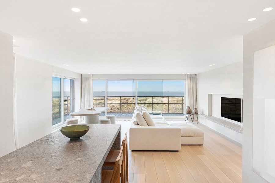 Ruime inkomhal met vestiaire en gastentoilet. Open designkeuken uitkijkend op een lichtrijke leefruimte met eethoek – allemaal badend in natuurlijk licht en met een panoramisch uitzicht op zee en duinen.