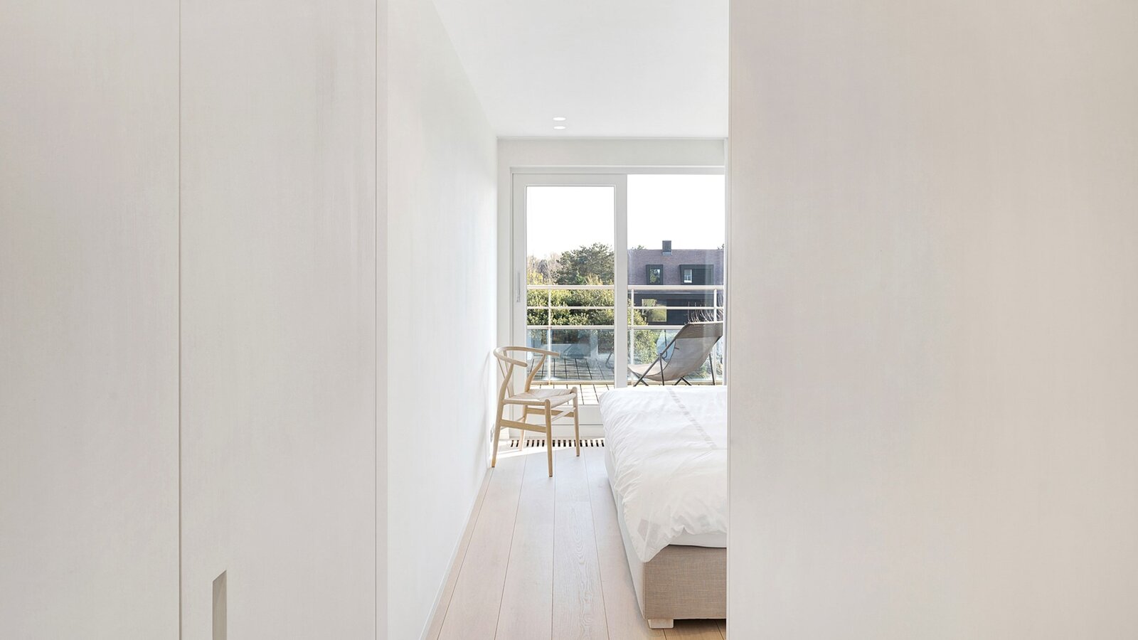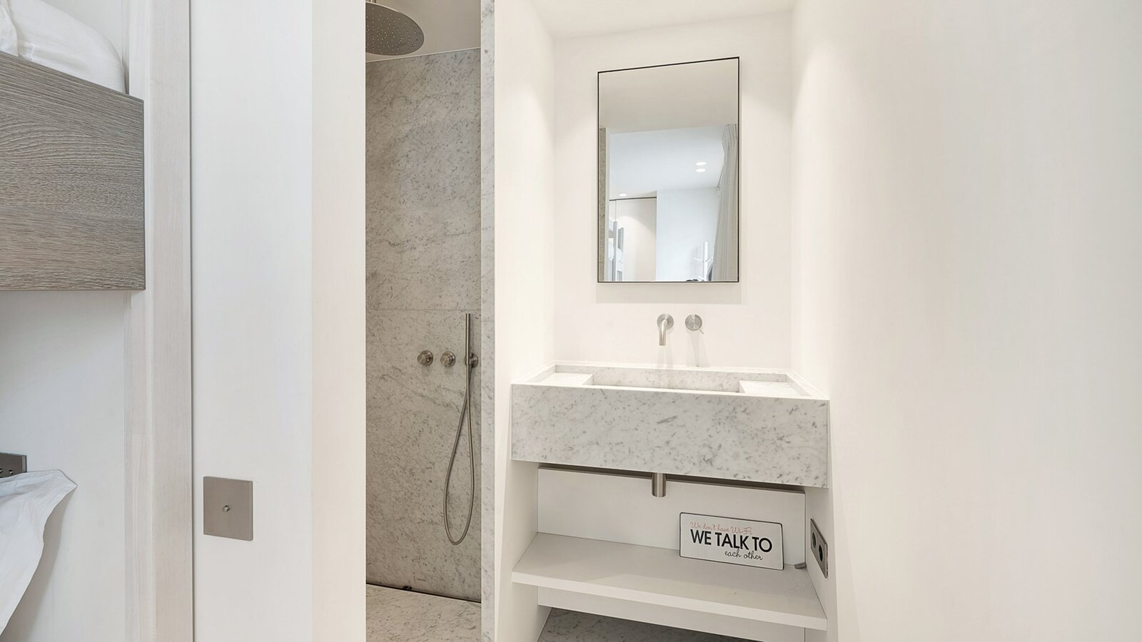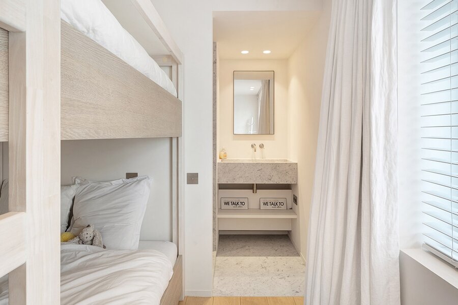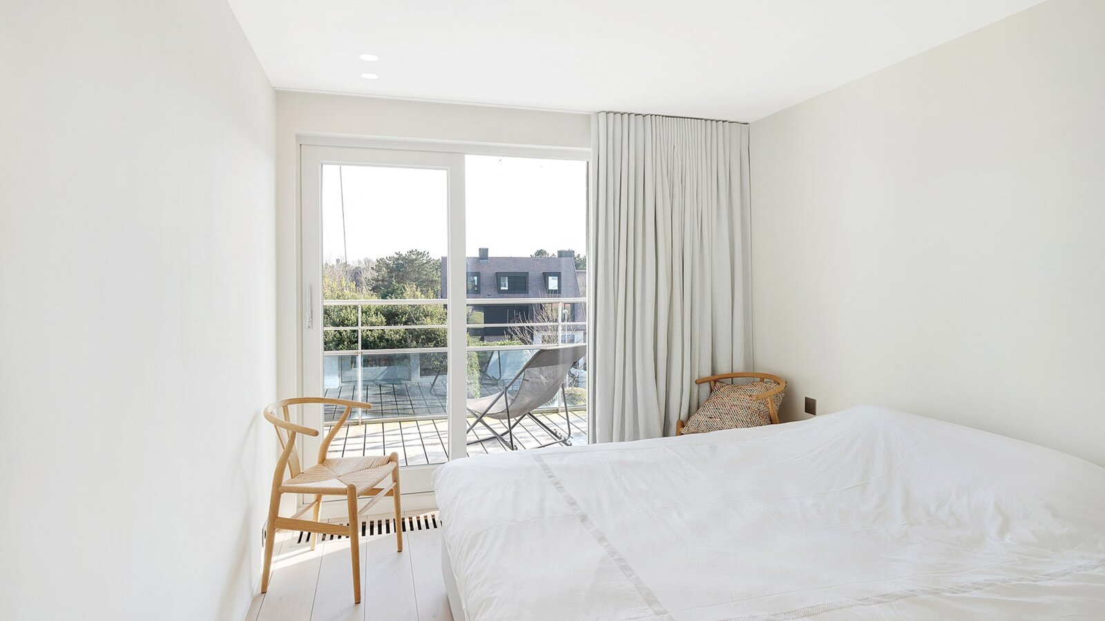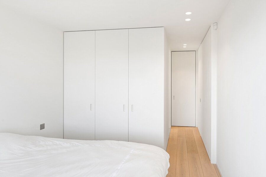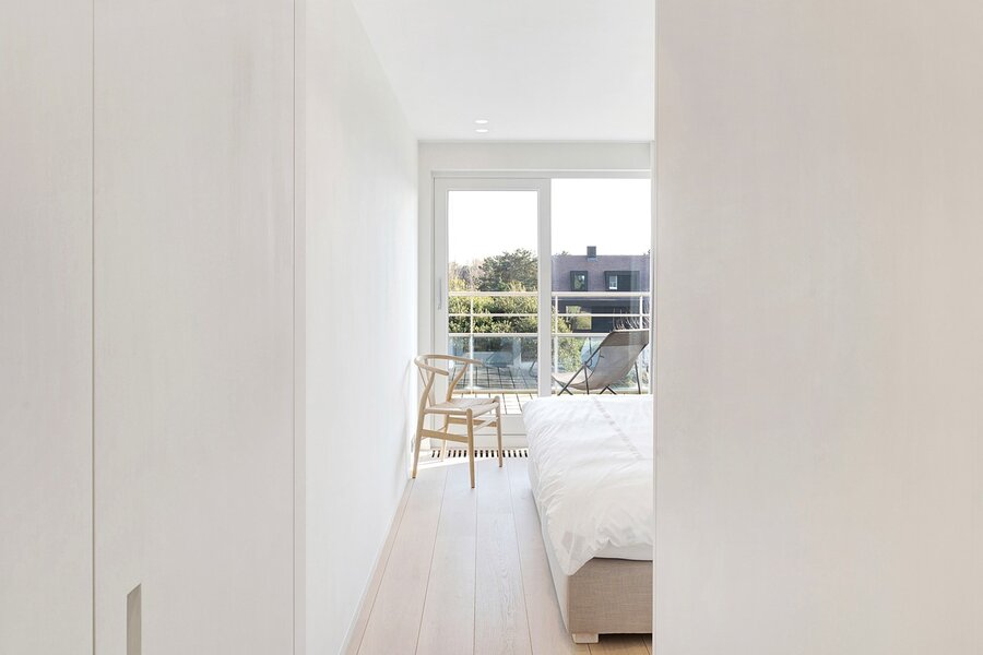 De tweede slaapkamer, eveneens met ingemaakte kasten, heeft een eigen douchekamer en toegang tot het terras. De derde slaapkamer beschikt over ingemaakte kasten en een aparte douche.