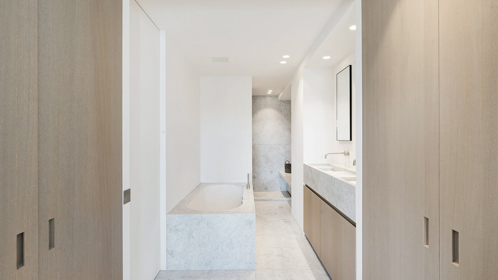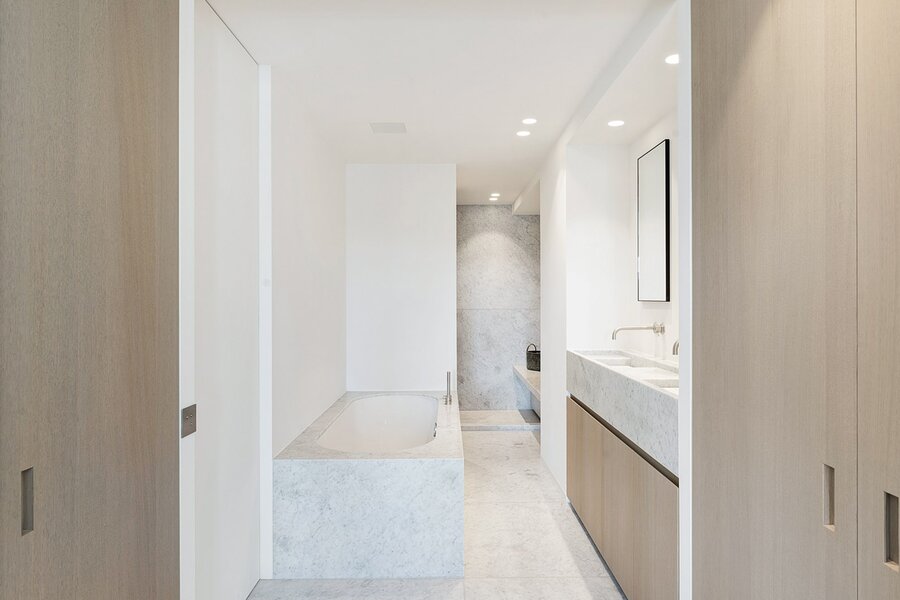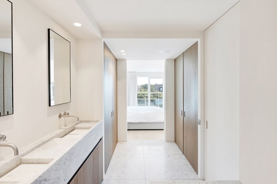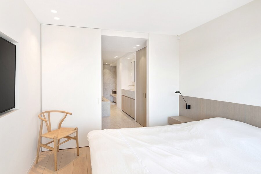De master bedroom biedt toegang tot het zuidgericht terras en beschikt over ingemaakte kasten en een luxueuze badkamer in marmer met bad, inloopdouche, dubbele lavabo en toilet.