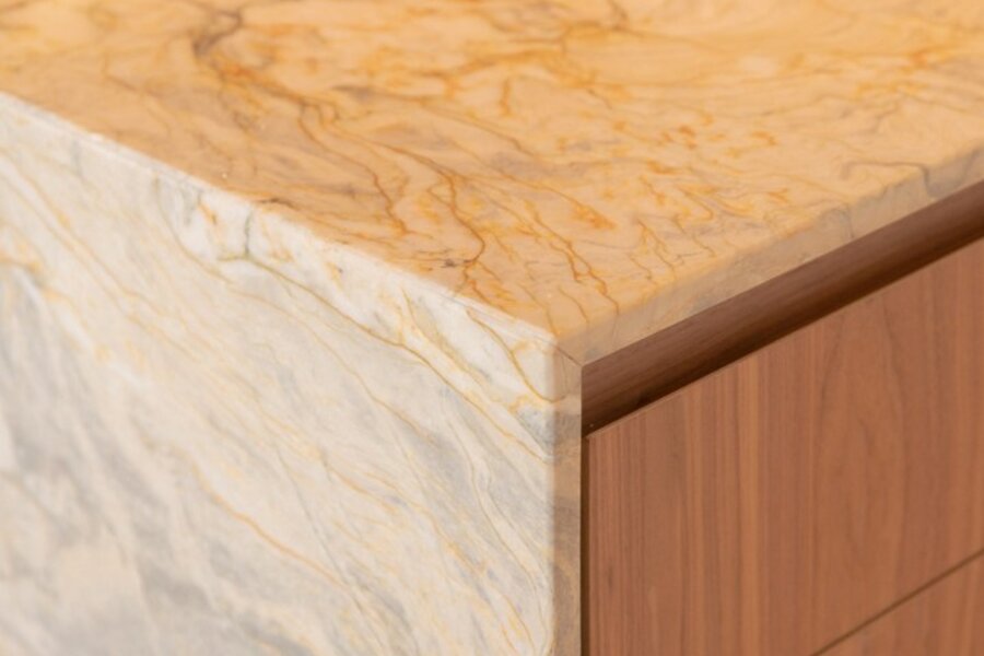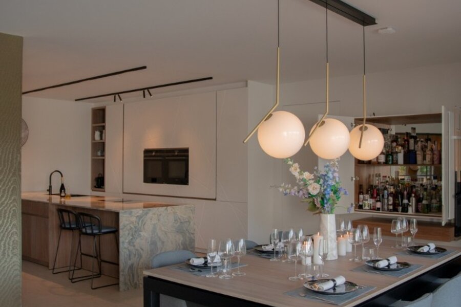 In het hart van het appartement is er een kookeiland voorzien van een prachtige kwartsiet natuursteen. De uitrusting voldoet aan de hoogste verwachtingen: BORA kookplaat, Siemens oven(-steamer), Quooker-kraan, Liebherr koelkast met ijsblokjesfunctie en een ingebouwde wijnfrigo.