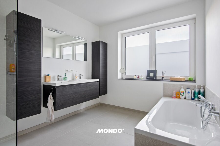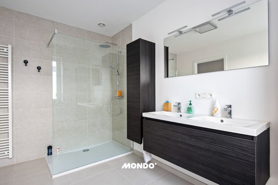 Op de benedenverdieping geniet je van een ruime, lichtrijke leefruimte met open keuken, een praktische wasplaats, toilet en een inpandige garage. Op de eerste verdieping bevinden zich drie ruime slaapkamers an respectievelijk 21,5 m², 16 m² en 14,1 m². Een stijlvolle badkamer met ligbad, inloopdouche en dubbele lavabo.