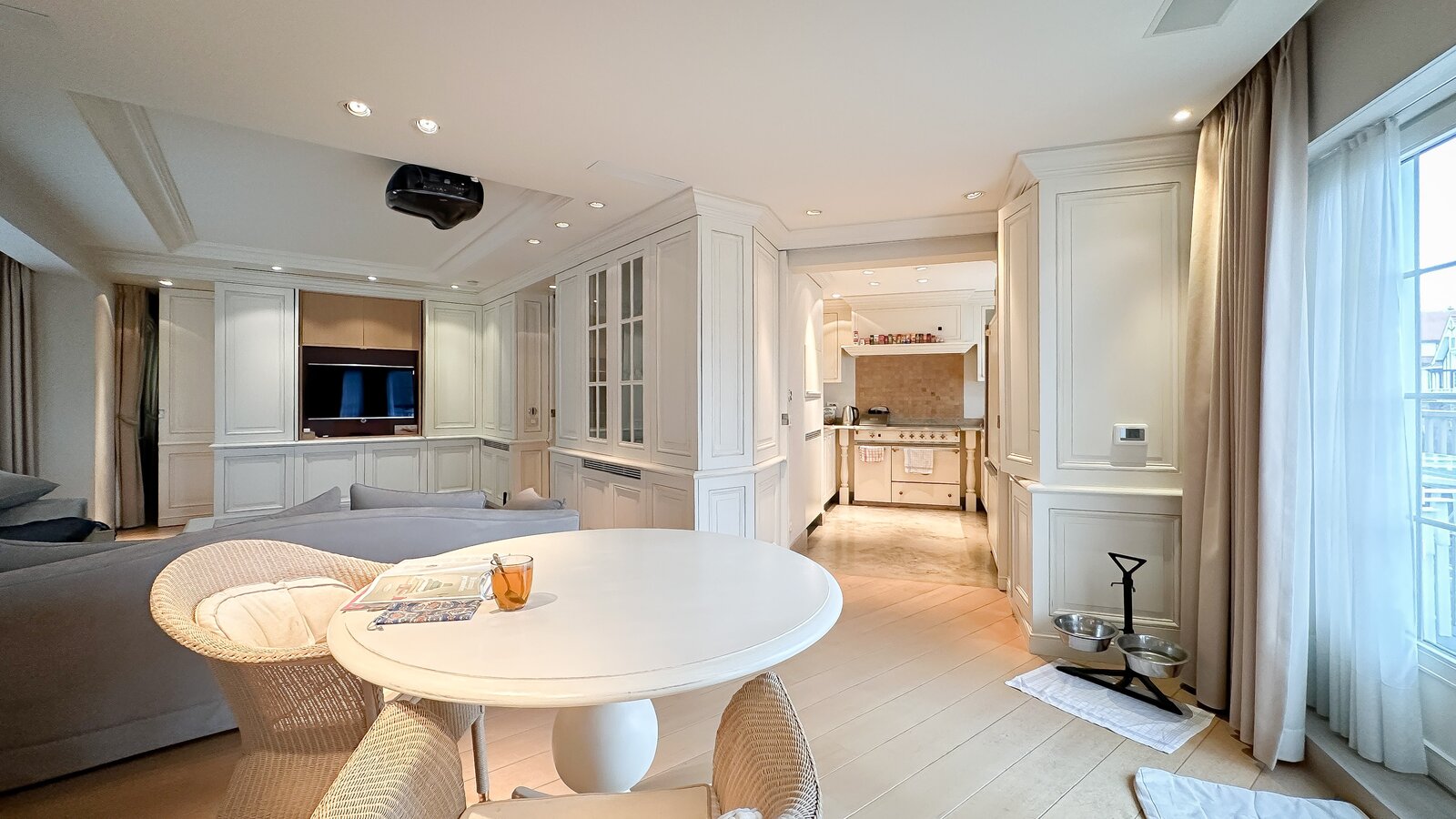 • Lichtrijke eetkamer verbonden met een hoogwaardig afgewerkte keuken, volledig uitgerust met o.a. een Lacanche fornuis en Miele-apparatuur