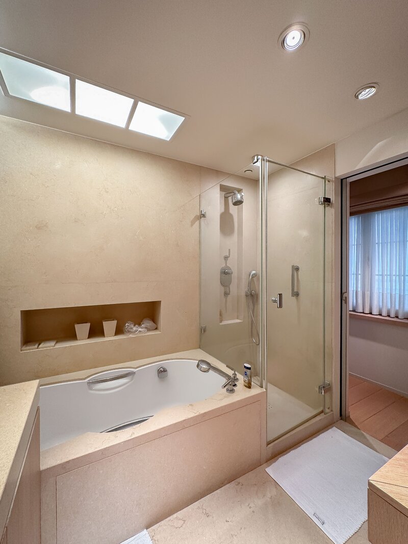 • Luxueuze badkamer in natuursteen, uitgerust met dubbele lavabo, toilet, douche én ligbad