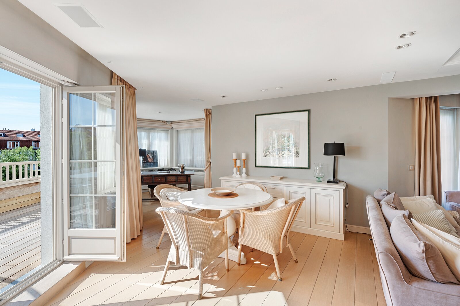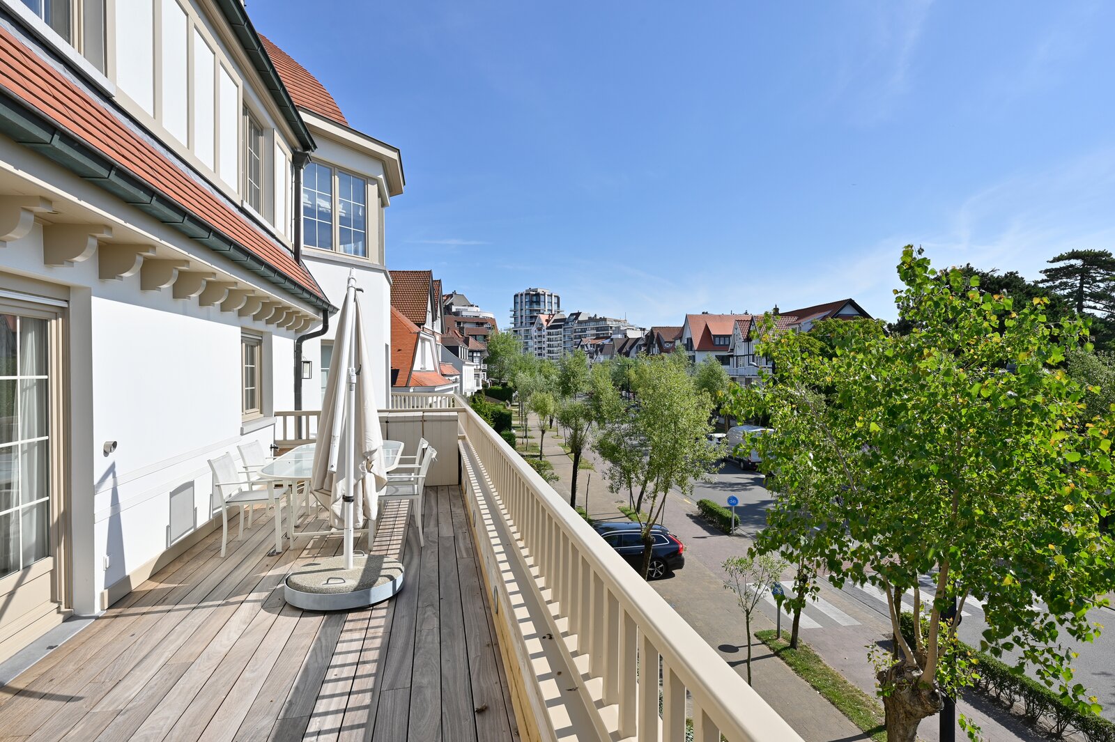 • Sfeervolle woonkamer met parketvloer en prachtig zicht op de villa’s van het Zoute