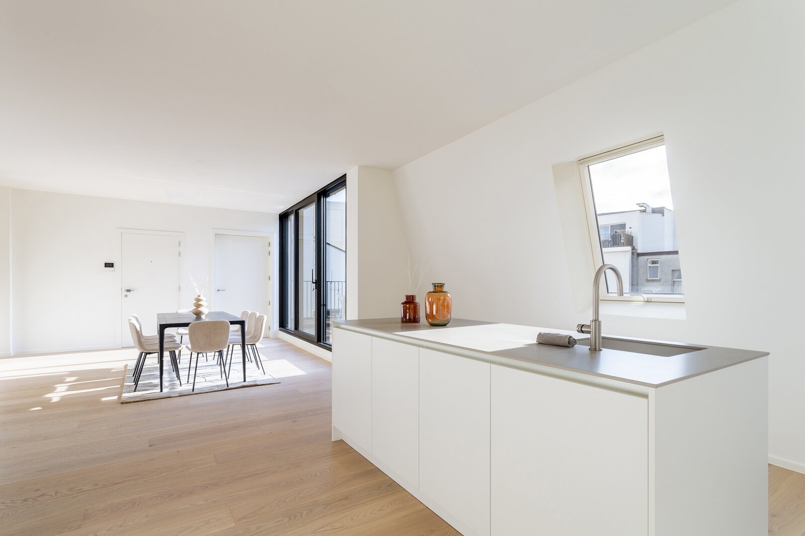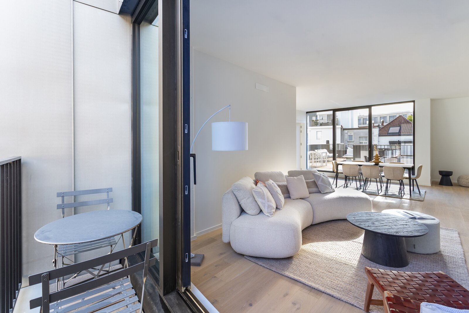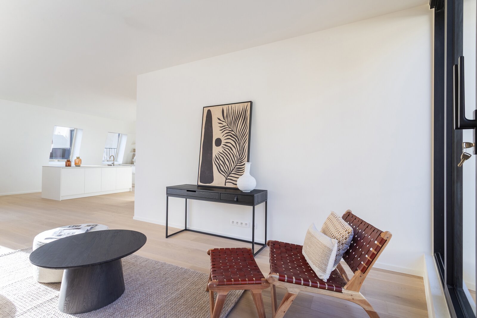 High-end finishes: continuous light parquet, custom-made details and premium materials. The spacious living room is bathed in natural light thanks to large windows and sliding doors opening onto a generous 31 m² rooftop terrace – ideal for a morning coffee or atmospheric dinner.