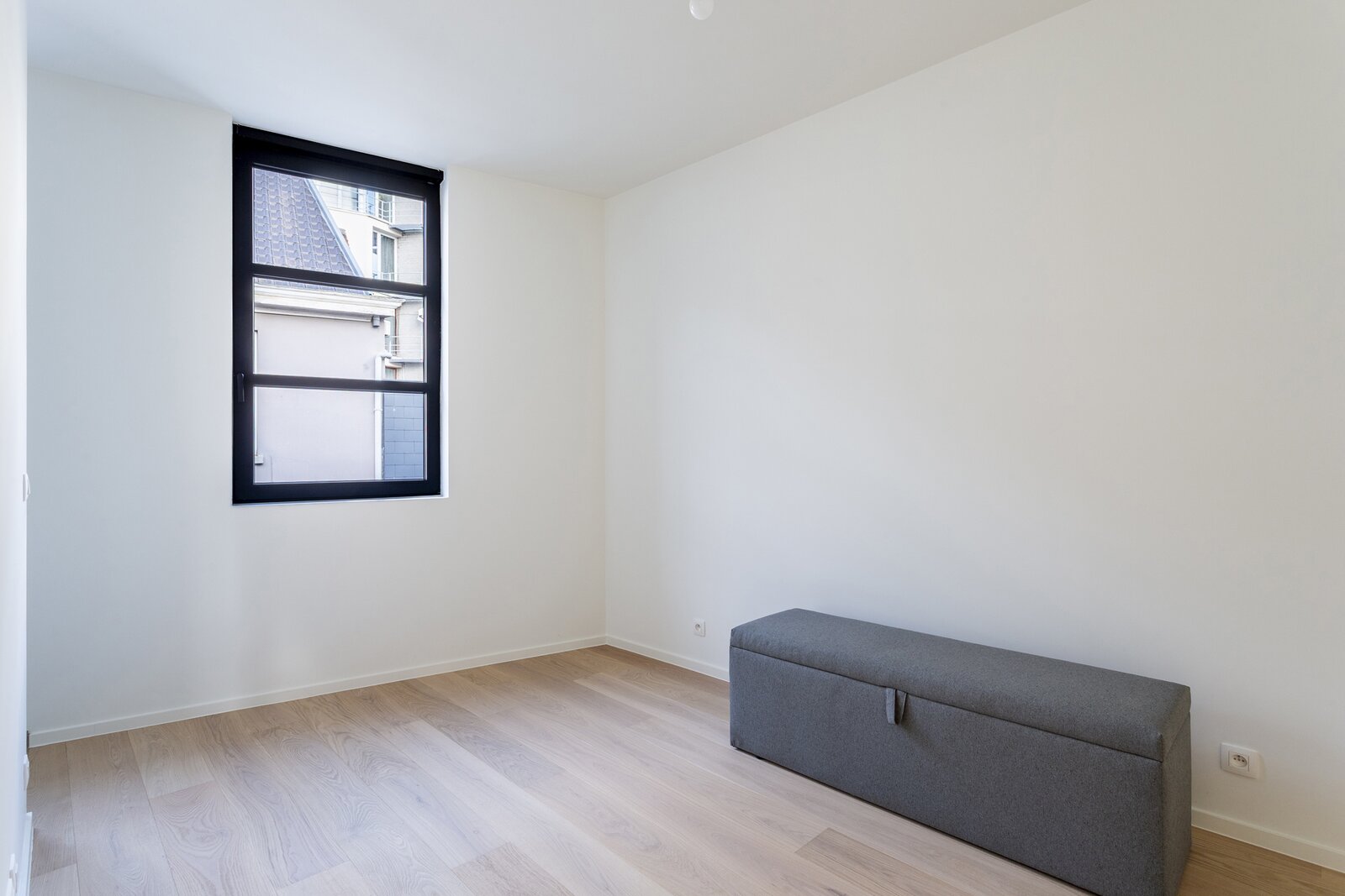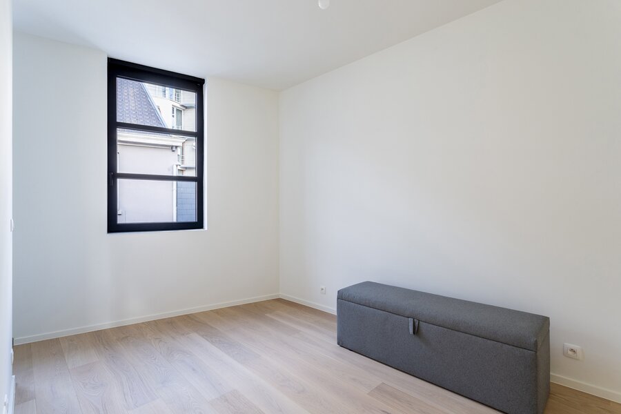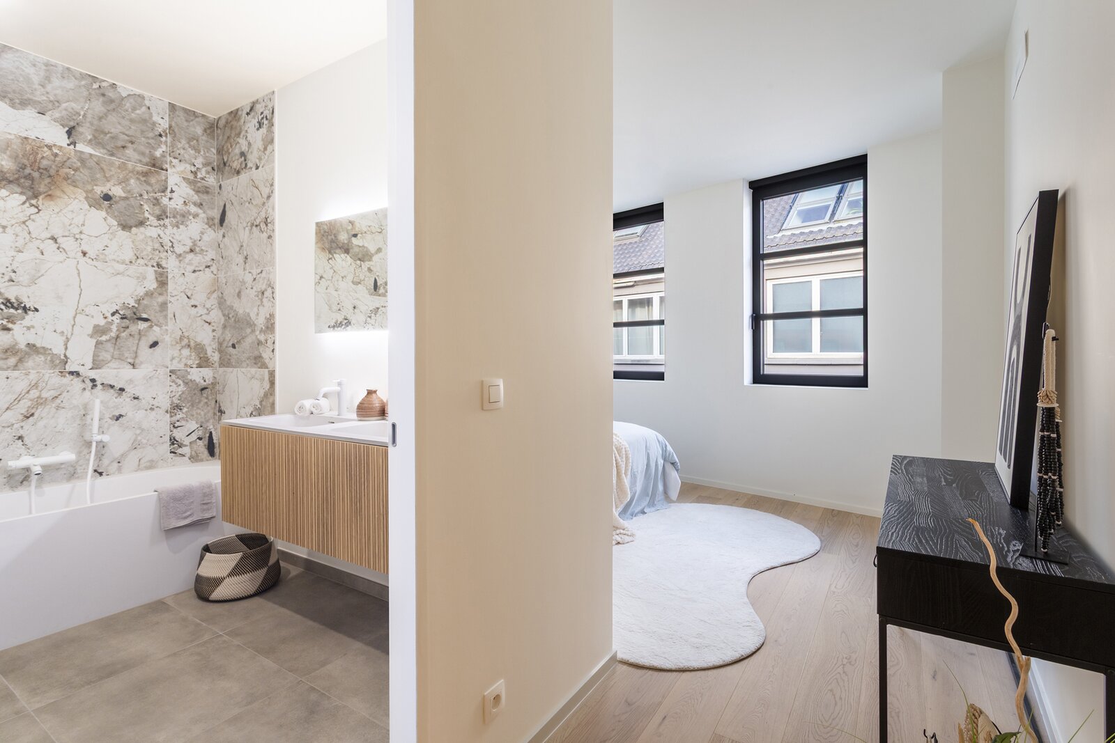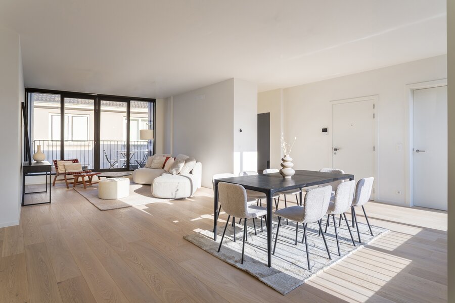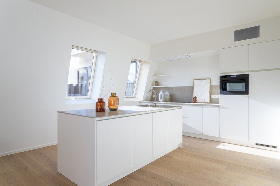 High-end finishes: continuous light parquet, custom-made details and premium materials. The spacious living room is bathed in natural light thanks to large windows and sliding doors opening onto a generous 31 m² rooftop terrace – ideal for a morning coffee or atmospheric dinner.