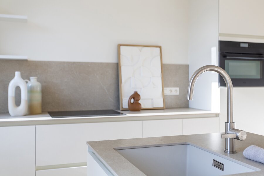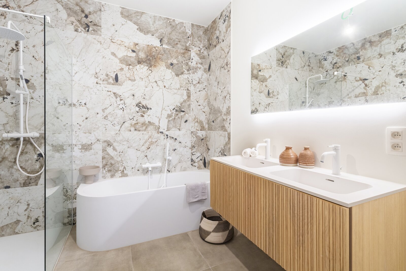 Two full bedrooms, each with its own bathroom. The master features a rain shower, bathtub, double sink and extra toilet, tastefully finished in marble and light wood. The second bedroom has its own walk-in shower and washbasin. Separate guest toilet.