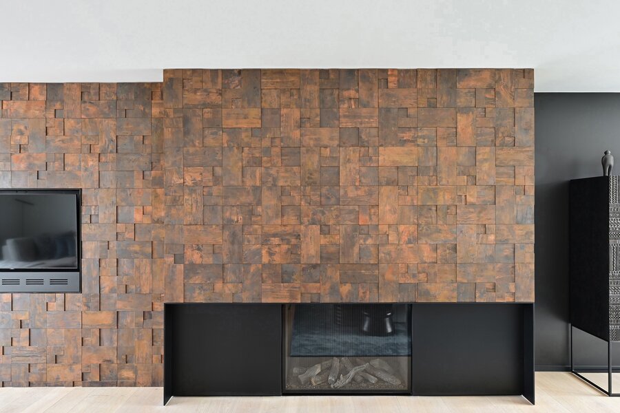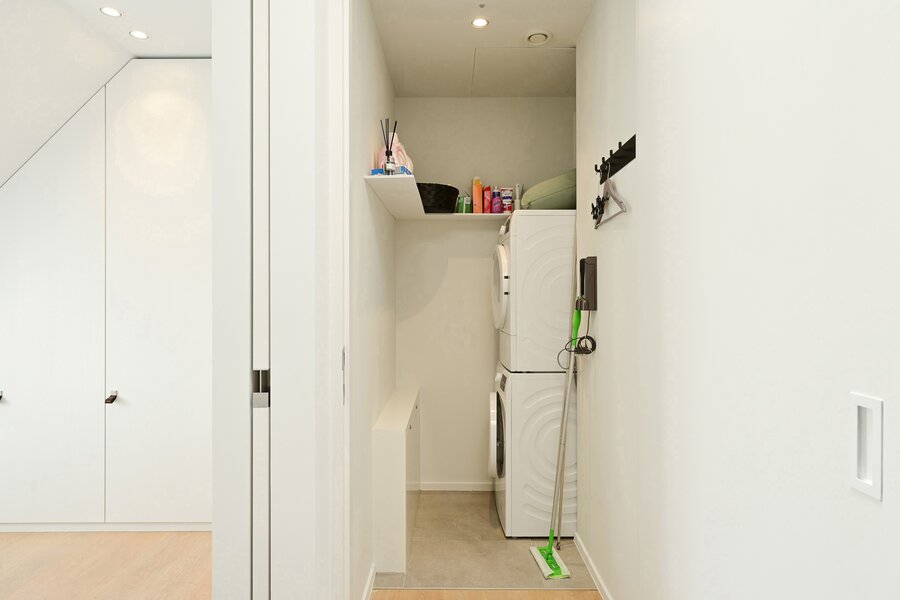 On the 5th floor, you will find a large living kitchen with high-quality Miele appliances and elegant Carrara marble, which connects to the dining room. The through-living room features a stylish gas fireplace finished in bronze and, like the kitchen, opens onto the sunny terraces. The west-facing terrace is equipped with a large sunshade and terrace heating, perfect for long evenings outside. Additionally, this floor includes a technical room, a storage room, and a guest toilet.
