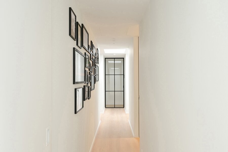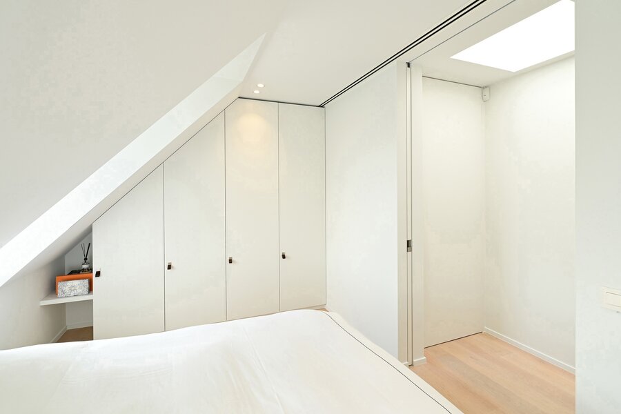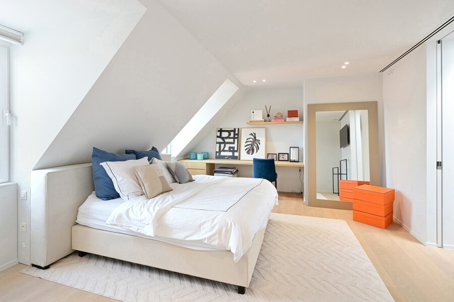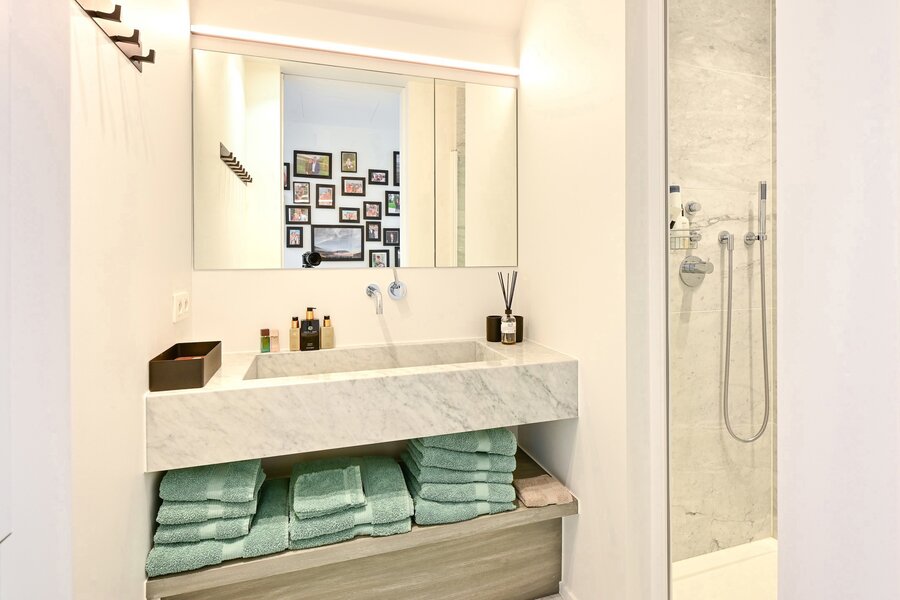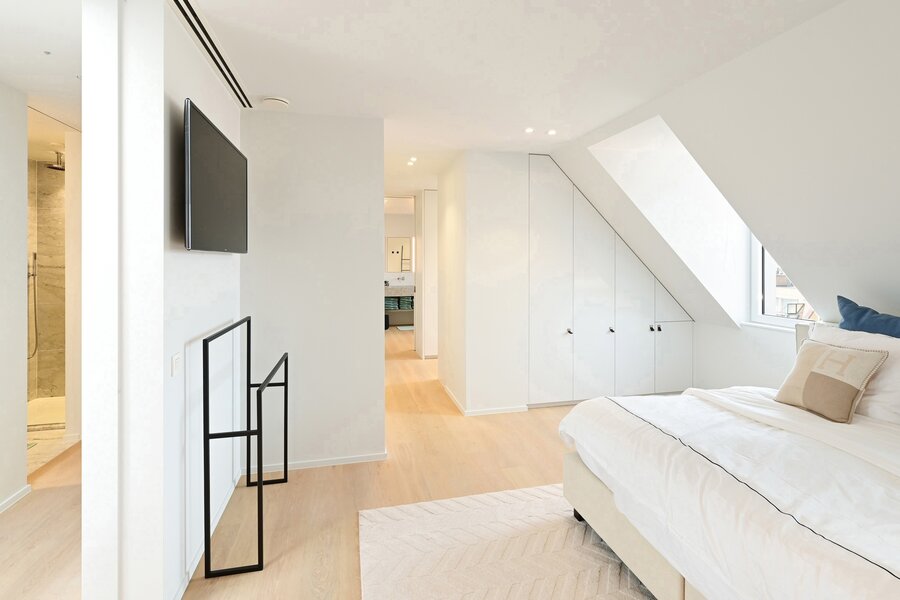 The 6th floor features three bedrooms, all with built-in wardrobes. The master bedroom has a private dressing room and an en-suite bathroom with a separate toilet, bathtub, walk-in shower, and spacious sink, all finished in luxurious Carrara marble. There is also a separate shower room, also in Carrara marble, and a practical laundry room.