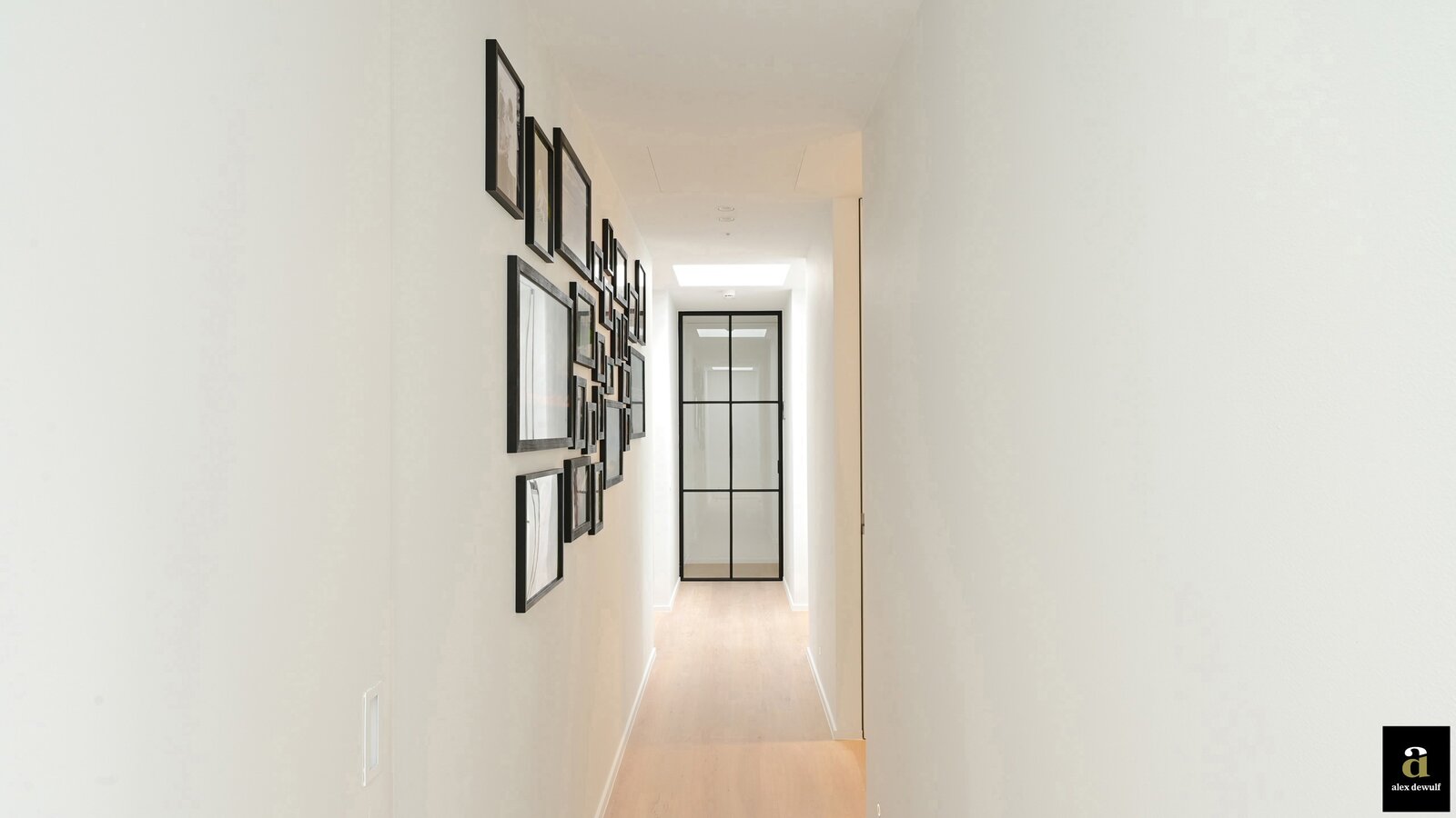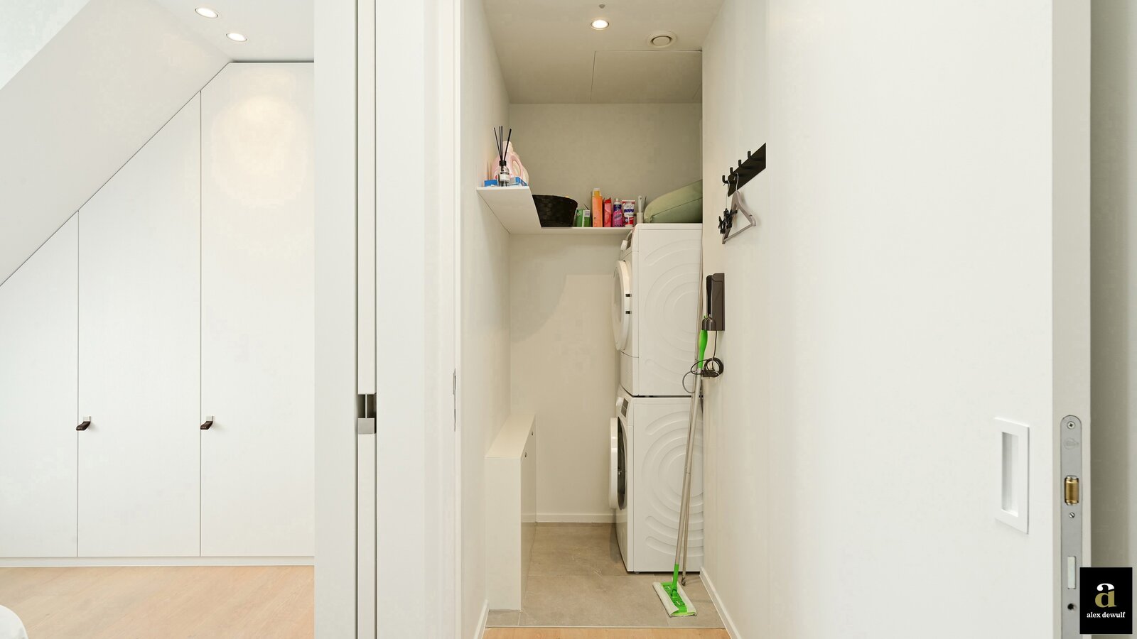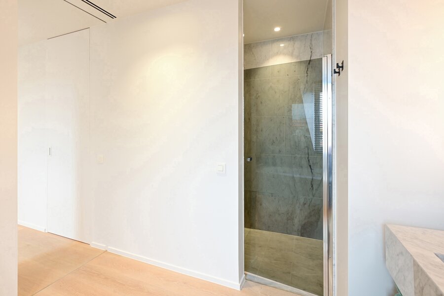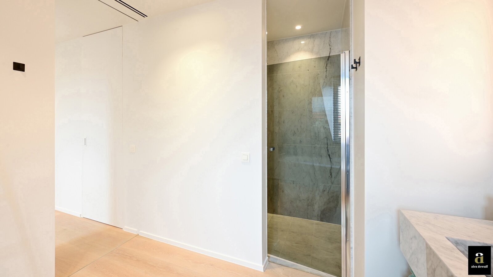 This apartment is equipped with modern amenities such as home automation, underfloor heating per room, separate air conditioning for each bedroom, an alarm system, and sun blinds. Extras include a bicycle storage room, two cellars, and the option to purchase two single garage boxes in the building.