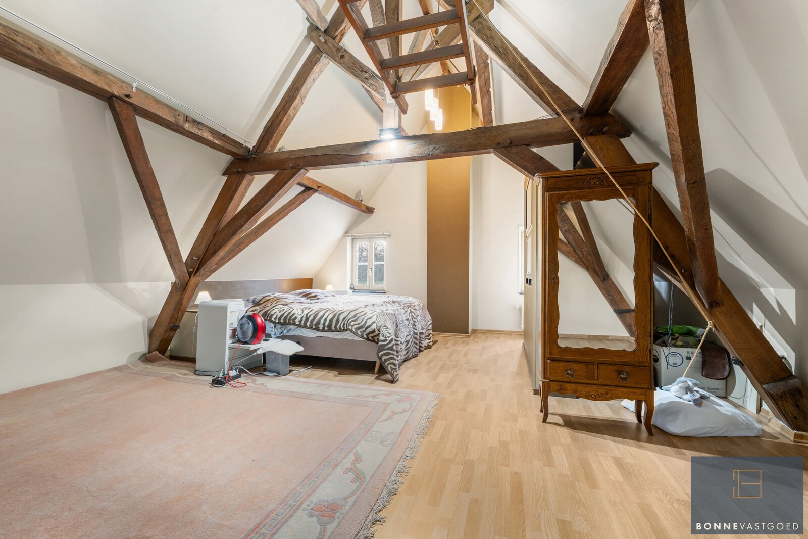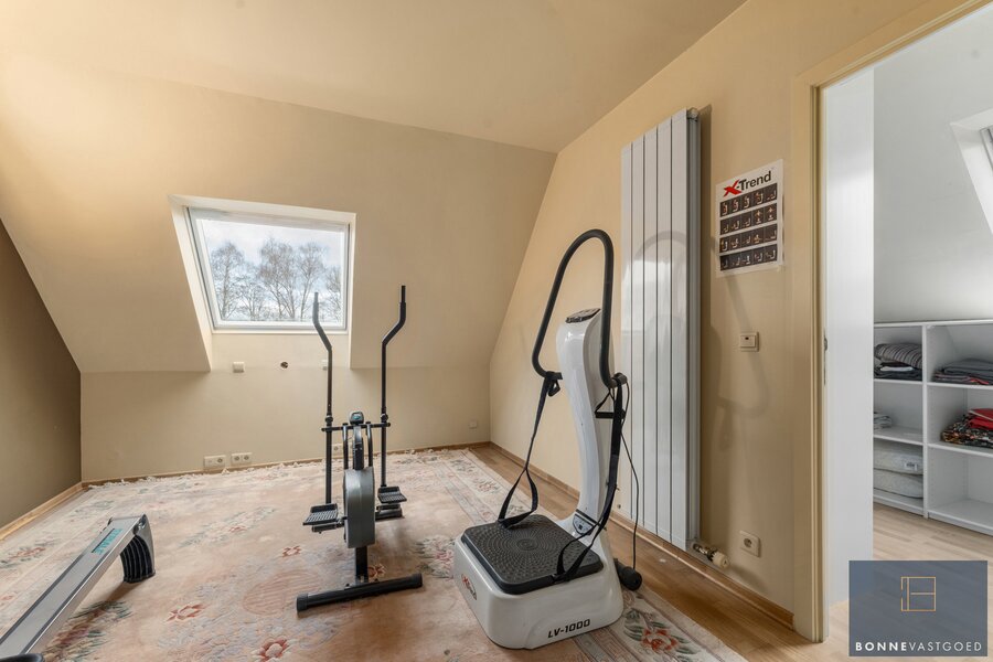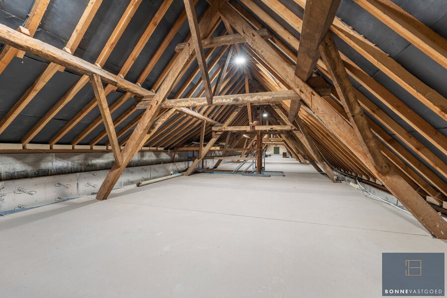 Op de bovenverdieping bevinden zich vier slaapkamers. Eén kamer springt meteen in het oog door de indrukwekkende originele gebintes, die het landelijke karakter extra benadrukken. Twee andere slaapkamers beschikken over een eigen mezzanine, ideaal als speelse slaaphoek, bureau of extra bergruimte. Verder is er op deze verdieping ook een badkamer aanwezig.