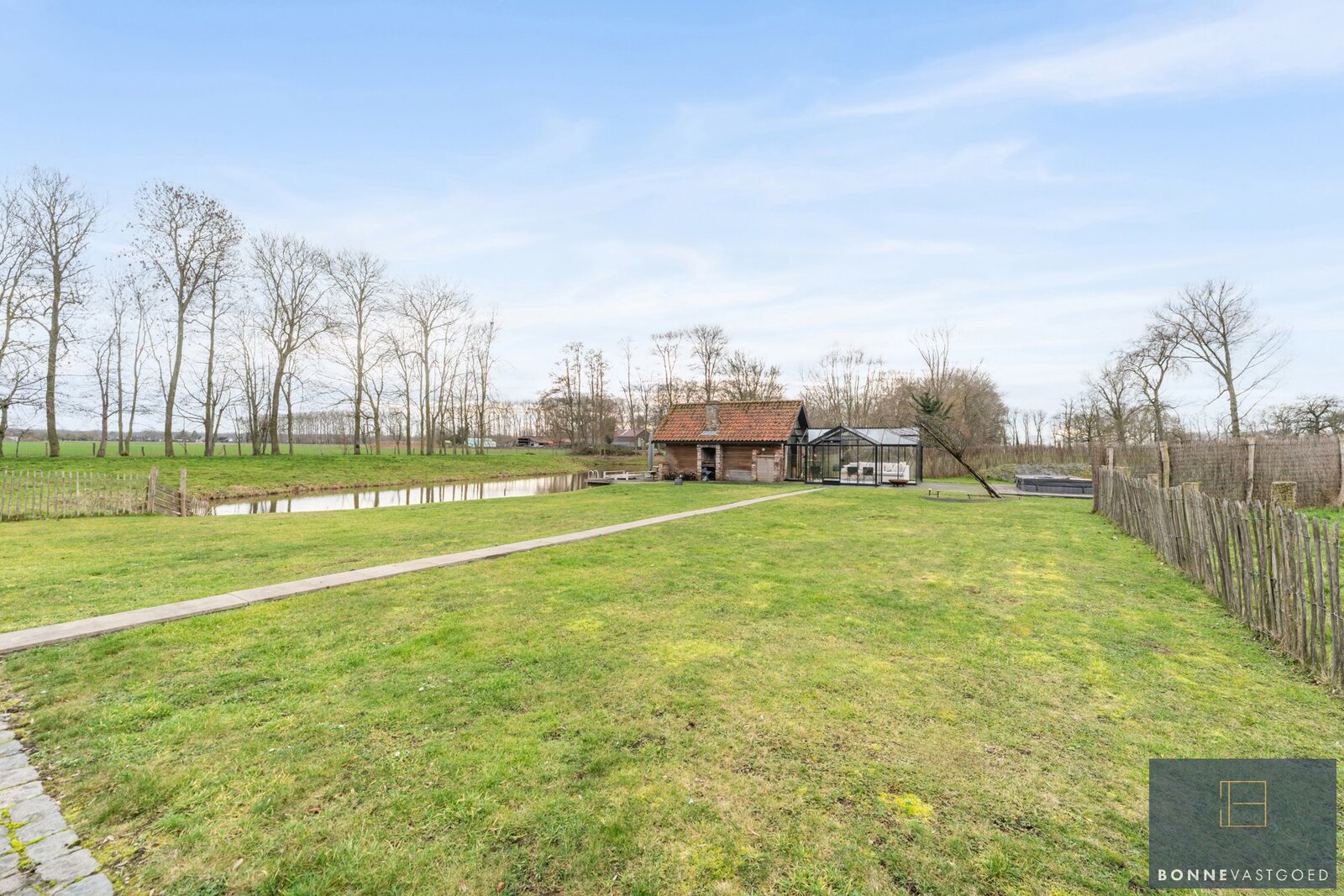 De prachtig aangelegde tuin met vijver en poolhouse vormt een harmonieuze overgang naar het omliggende open landschap. Dankzij de royale perceelgrootte en de doordachte inplanting van de gebouwen geniet u hier van maximale privacy en eindeloze mogelijkheden om het buitenleven ten volle te beleven.
