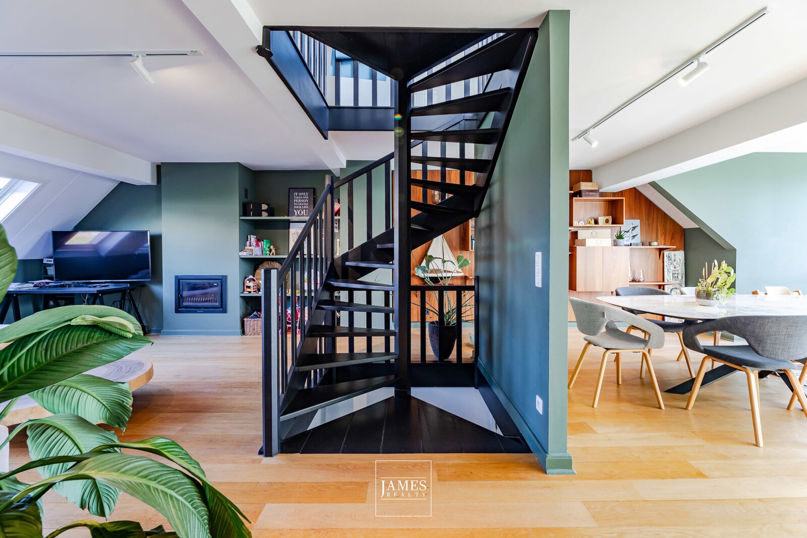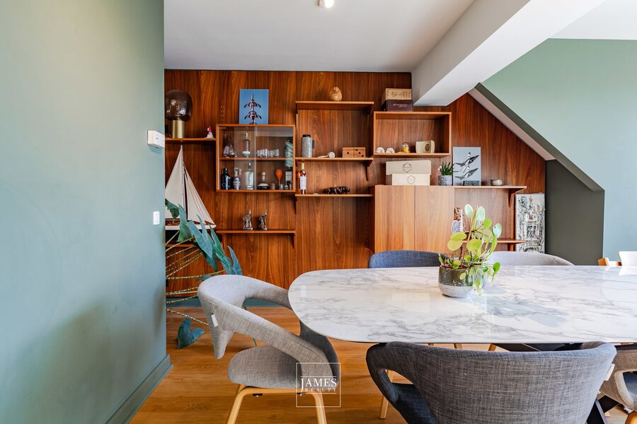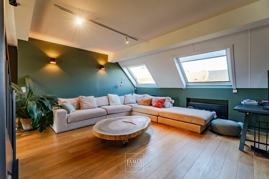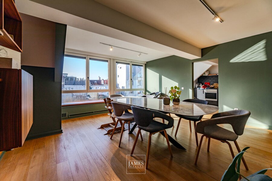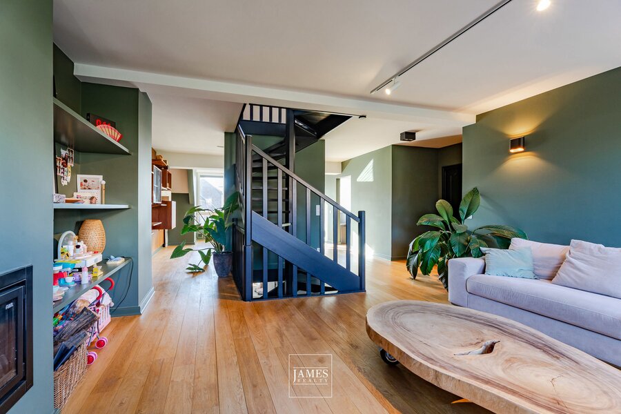 With a surface area of ± 212 m² (according to PEB), the flat occupies the top three floors of a small two-unit condominium and underwent extensive renovation in 2019. Access is via a private lift leading to the entrance hall, which opens onto the living room with its open fire on one side and the dining room and kitchen on the other, all bathed in light.