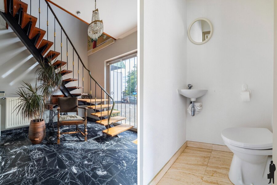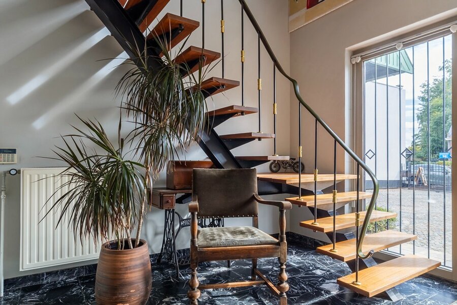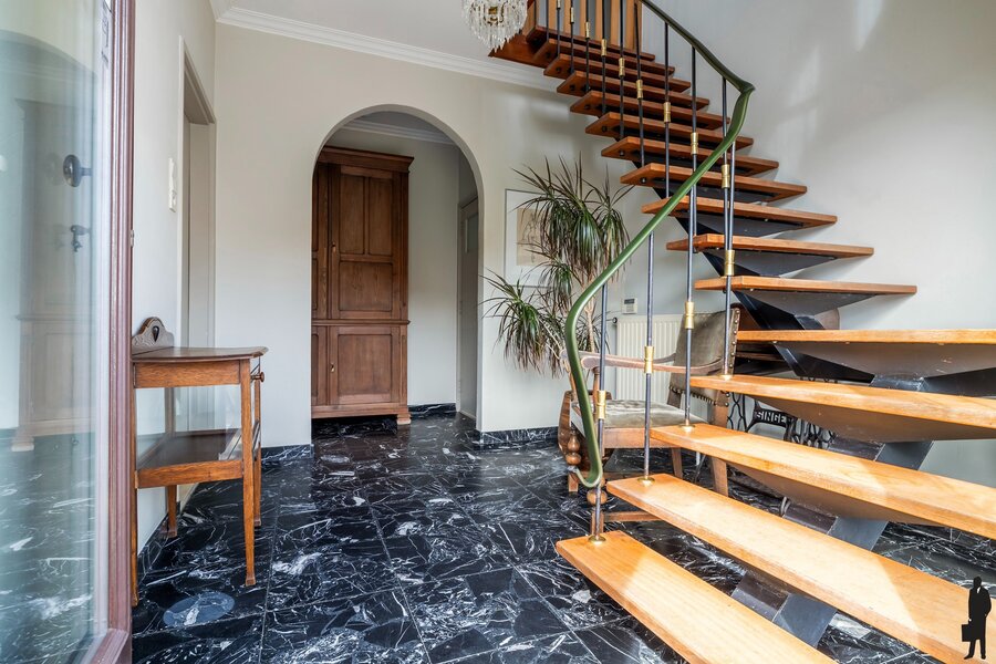 - Ruime ontvangsthal met natuurstenen vloer en trapopgang naar de eerste verdieping