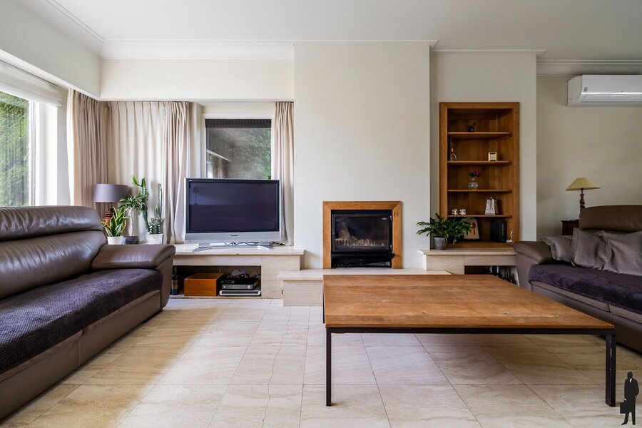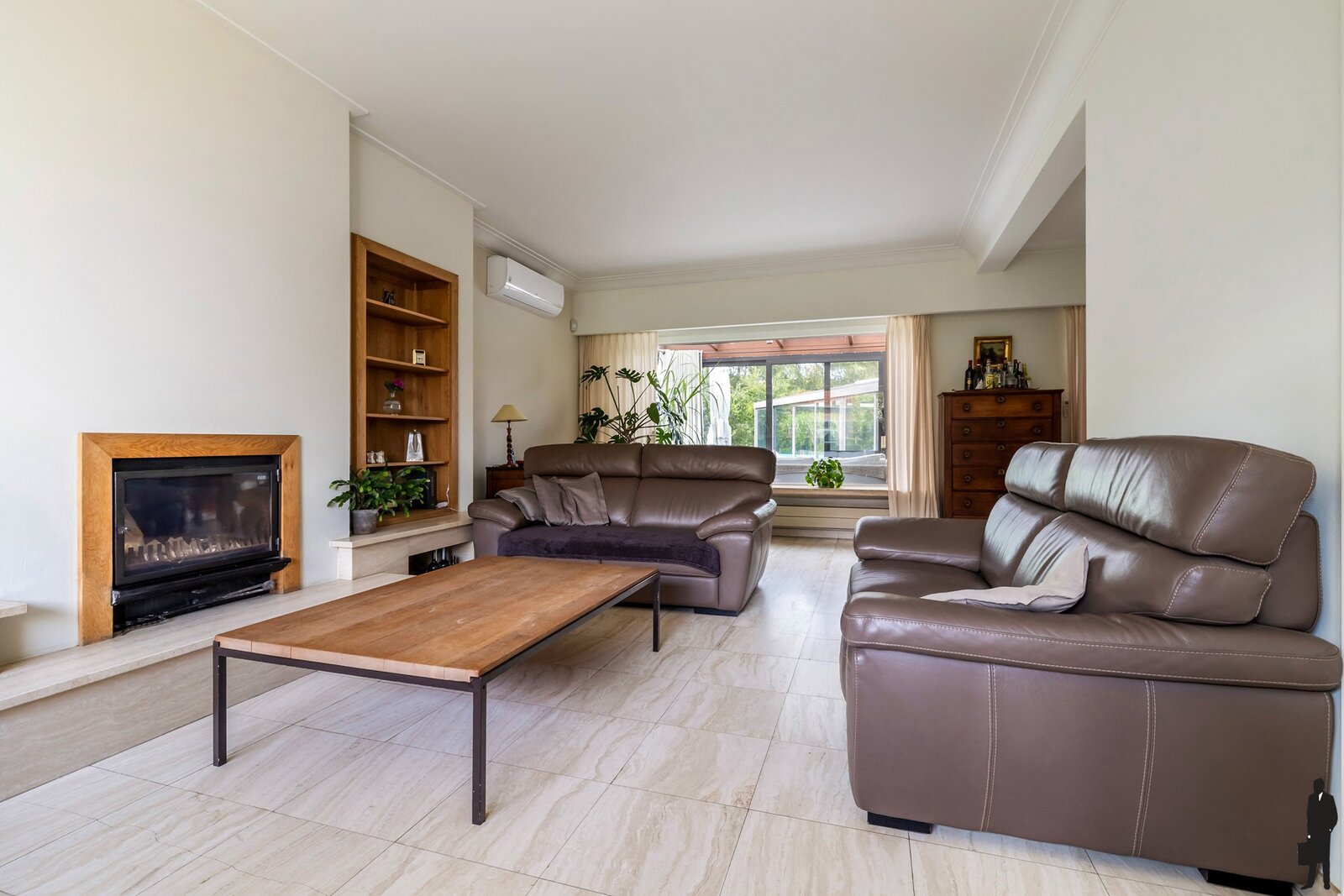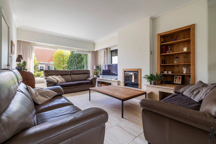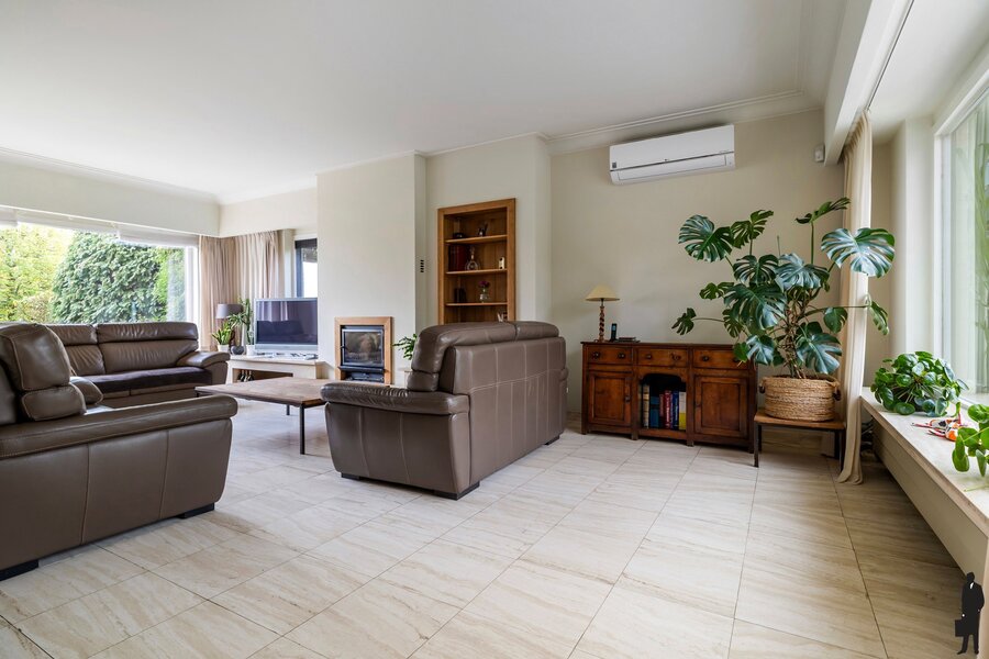 - Sfeervolle woonkamer (ca. 42 m²) met Travertin vloer, open haard en airconditioning. Via een schuifpui directe toegang tot de tuinkamer